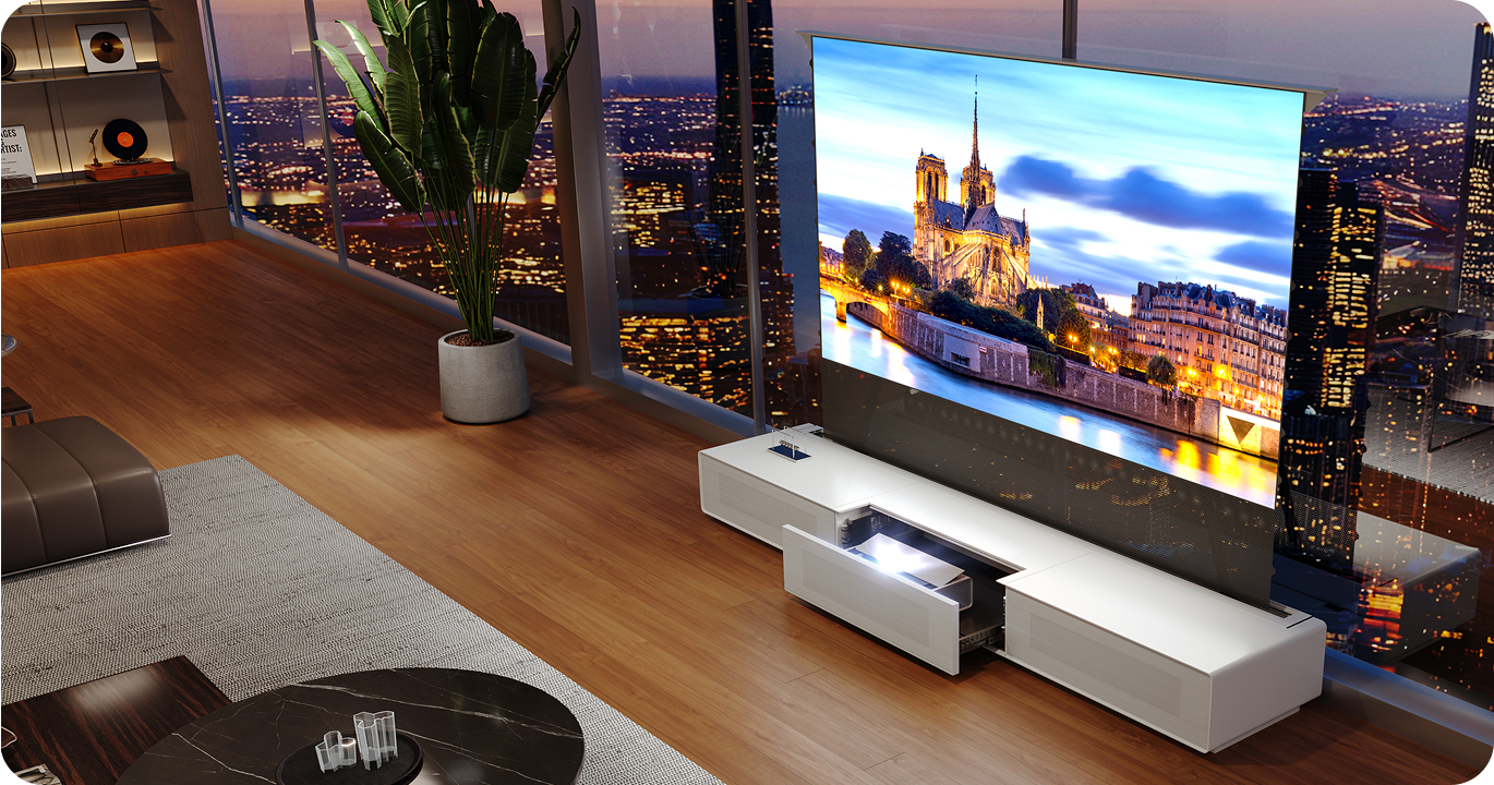 This motorized screen of the Nothing Projector delivers an exceptional cinematic experience, thanks to its ALR technology and 170° wide viewing angle, ensuring clear, vibrant images even in bright environments. It stands out for its voice assistant compatibility as well as its autonomous, silent operation — ideal for flexible, hassle-free installation with no renovation work required.