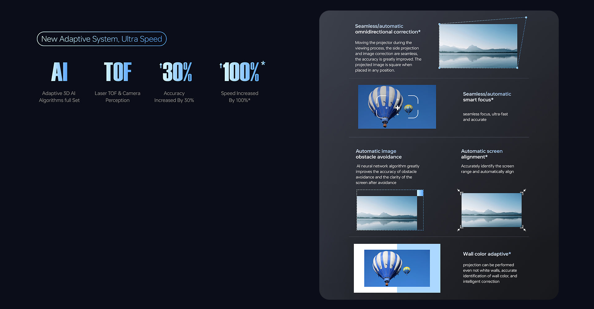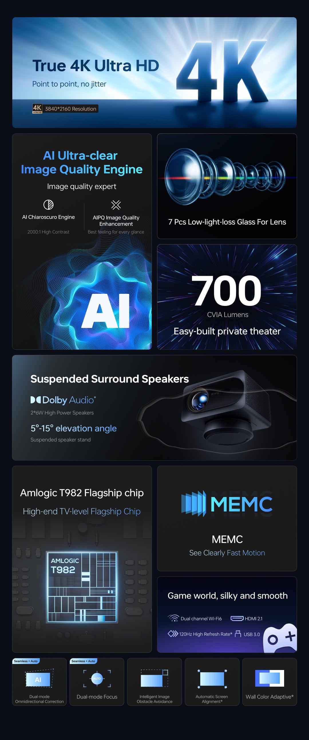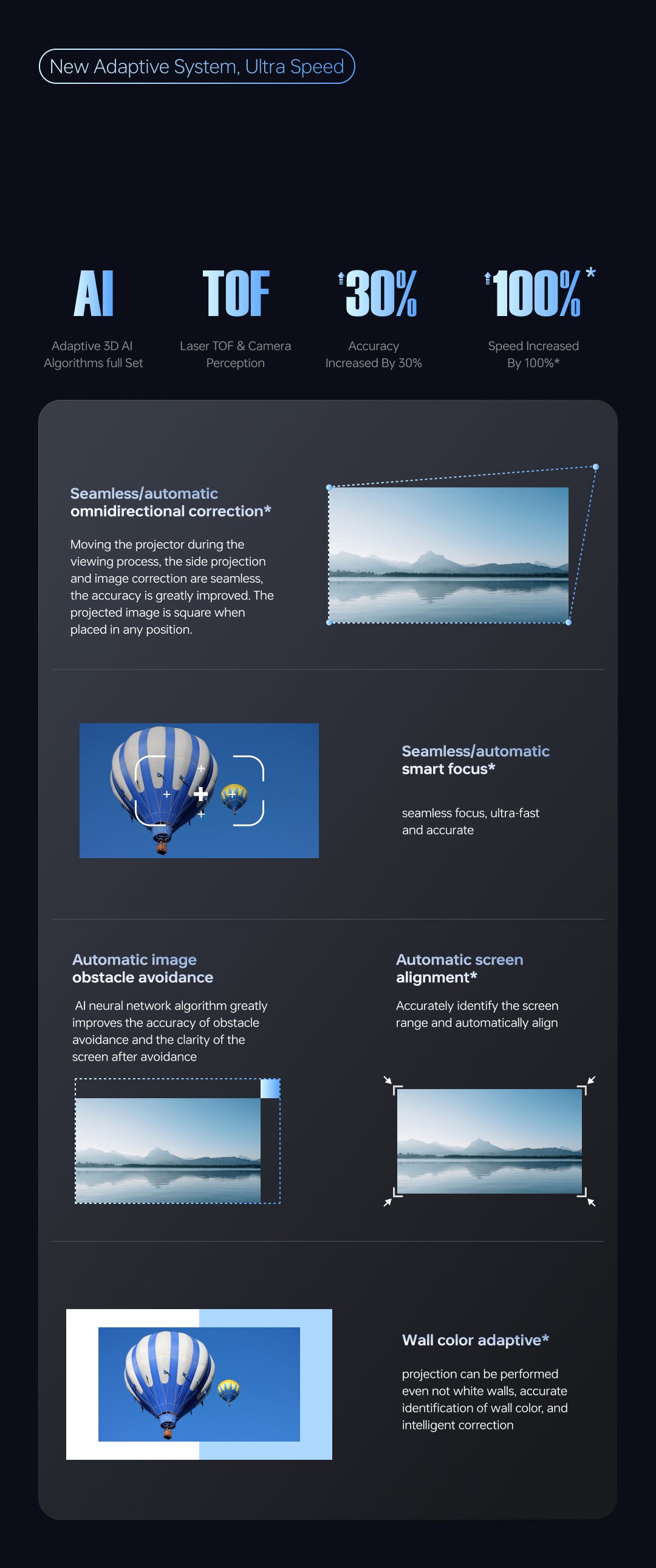 * Bietet Dolby Audio, Geräuschpegel unter 30 dB und intelligente Hindernisvermeidung und automatisch leinwand Ausrichtung.