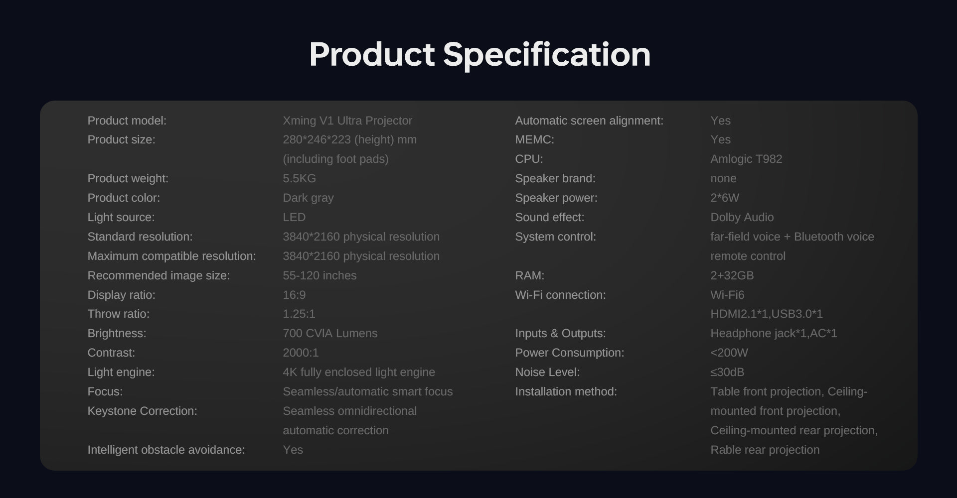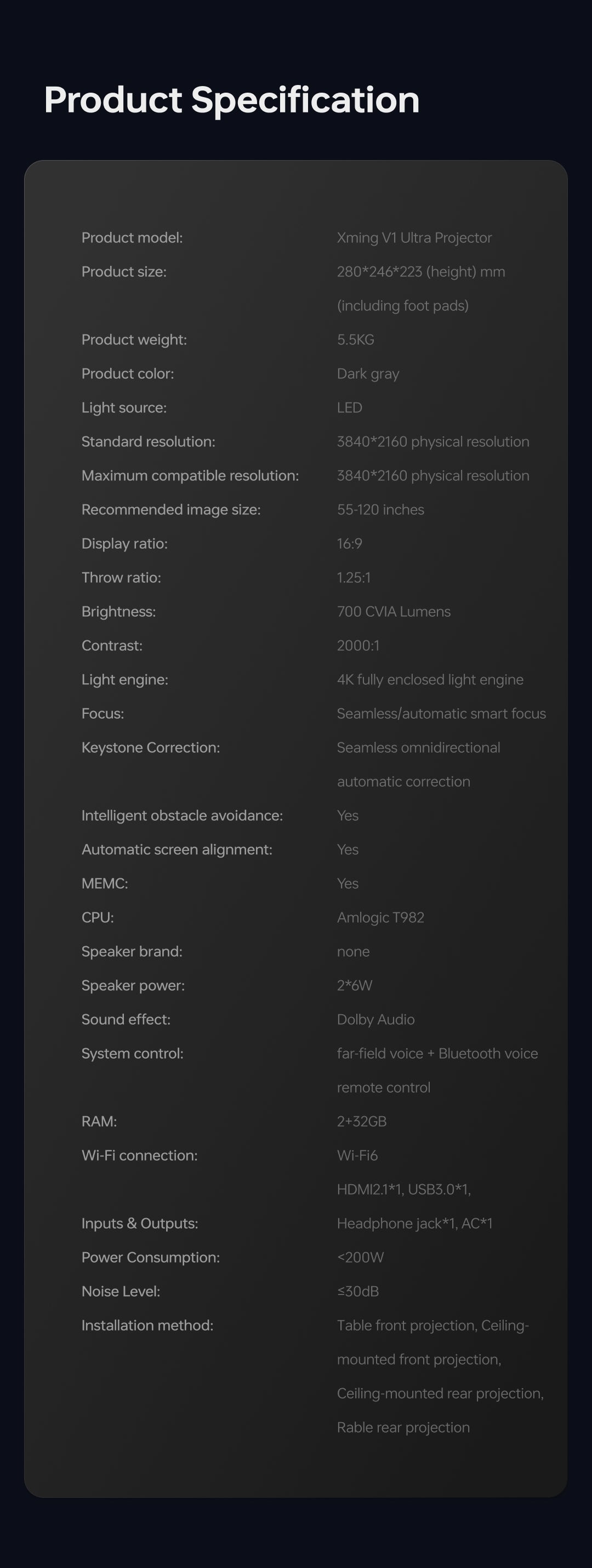 * Der V1 Ultra Projector verfügt über ein schlankes dunkelgraues Design und eine kompakte Größe (11 x 10 x 9 Zoll) mit einem leichten Build (12 lbs/5,5 kg).