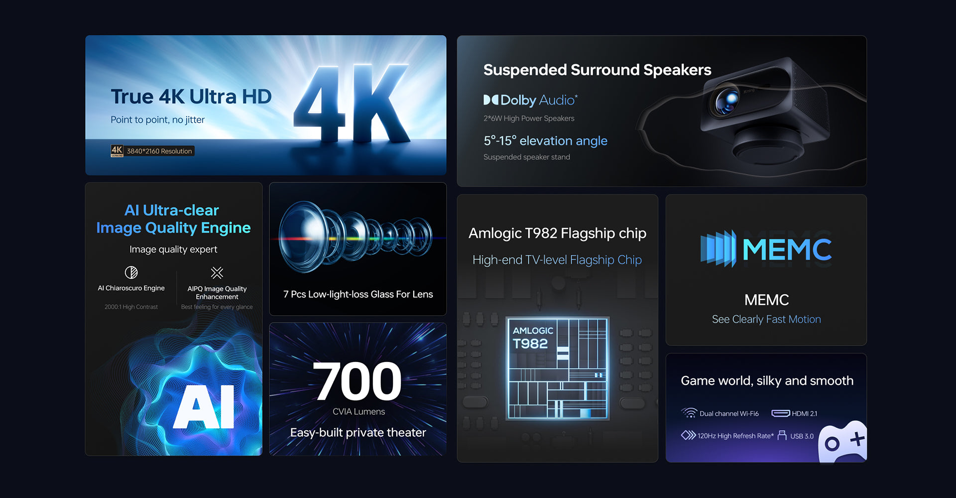 * Liefert eine atemberaubende 4K -Auflösung und 515 ISO -Lumenhelligkeit mit einem 4K -LED -LED -Leuchtmotor.