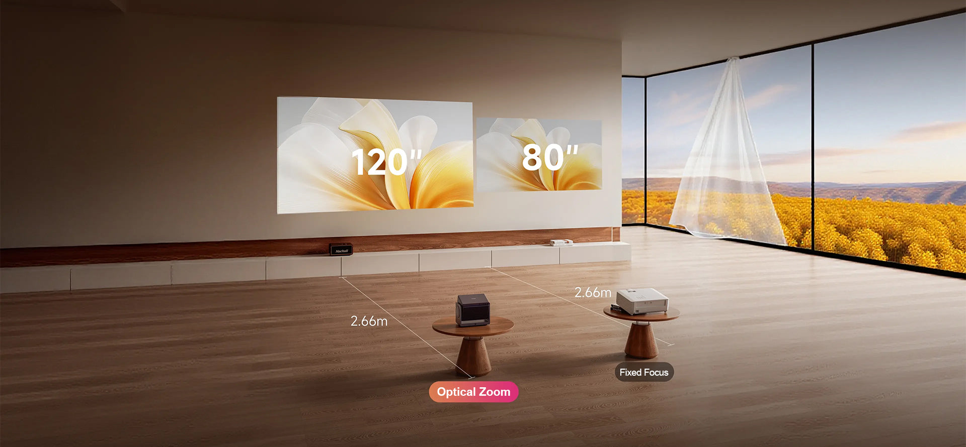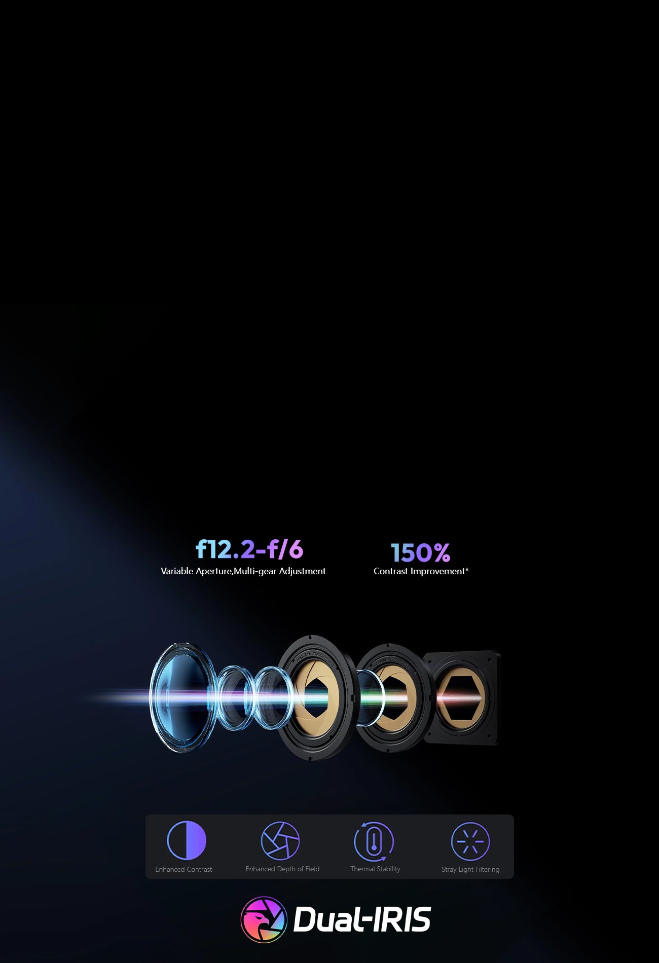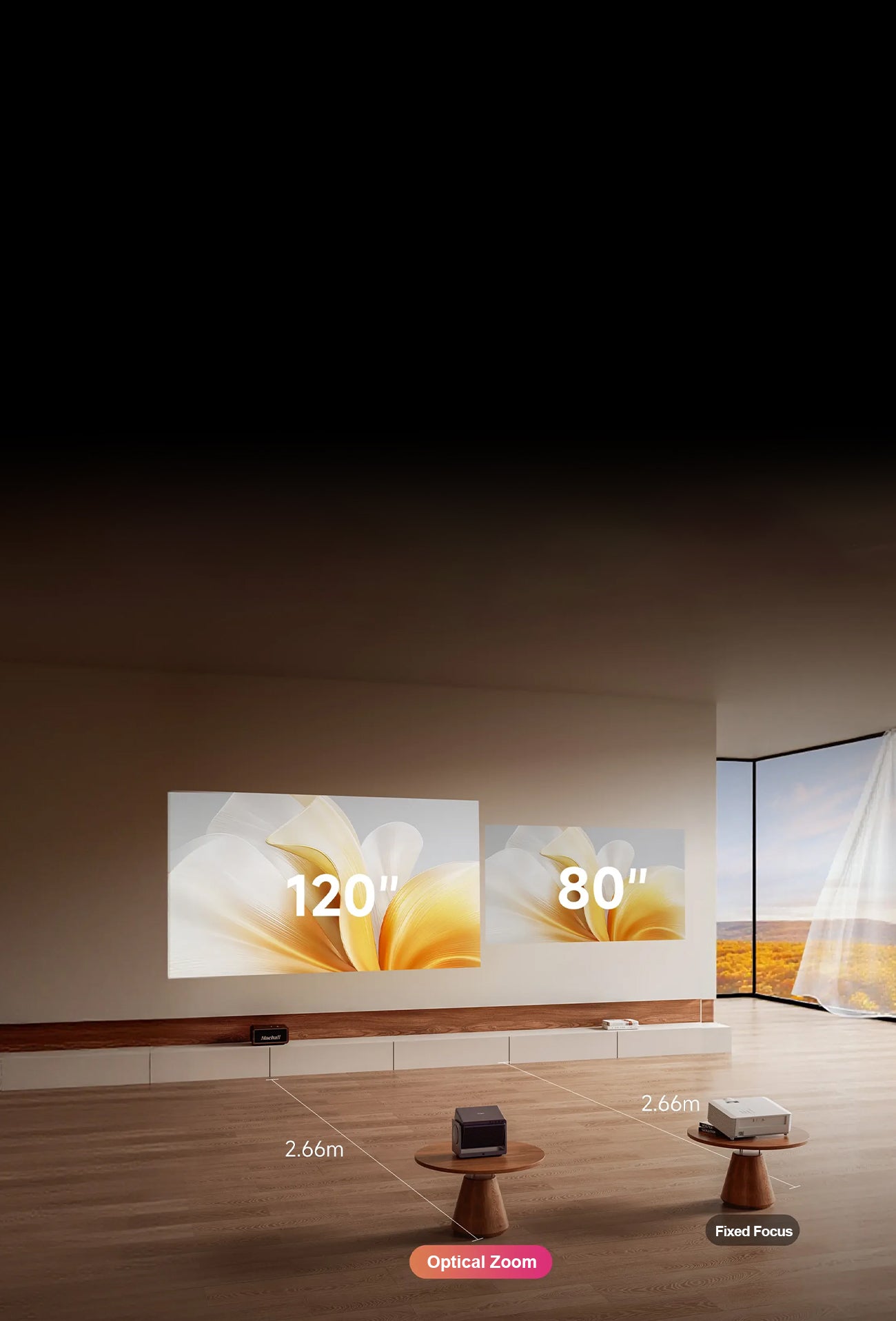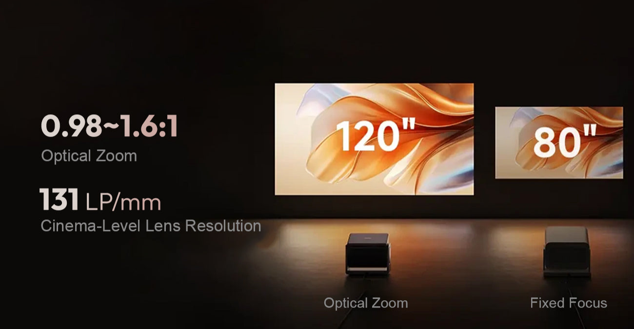 The world’s first three-stage variable aperture (f/2.2–f/6) boosts contrast by 150%, while the 0.98–1.6:1 optical zoom delivers a flexible 100–300” projection without image loss. A master-crafted cinema lens enhances sharpness by 40%, producing edge-to-edge precision even at large screen sizes.