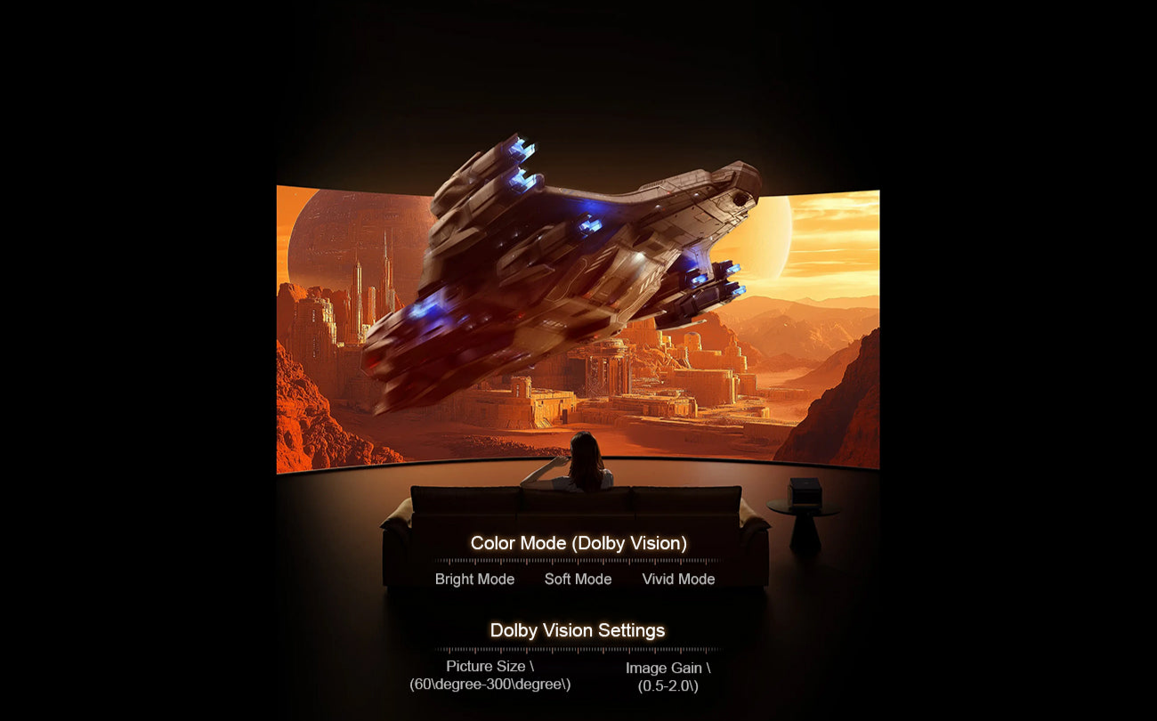 Personalize settings for different projection sizes, screen gains, and viewing angles. Precisely adapts the Dolby Vision mapping brightness for various environments, offering a shocking viewing experience with seamless Dolby adjustment.