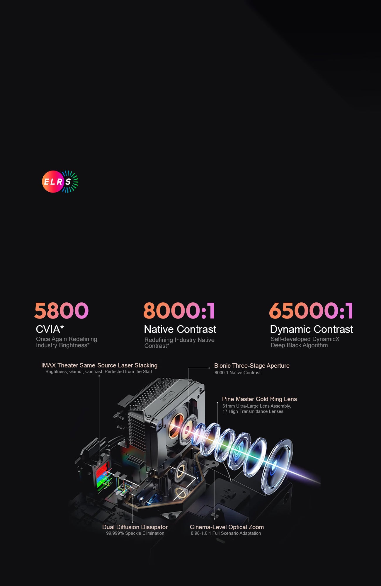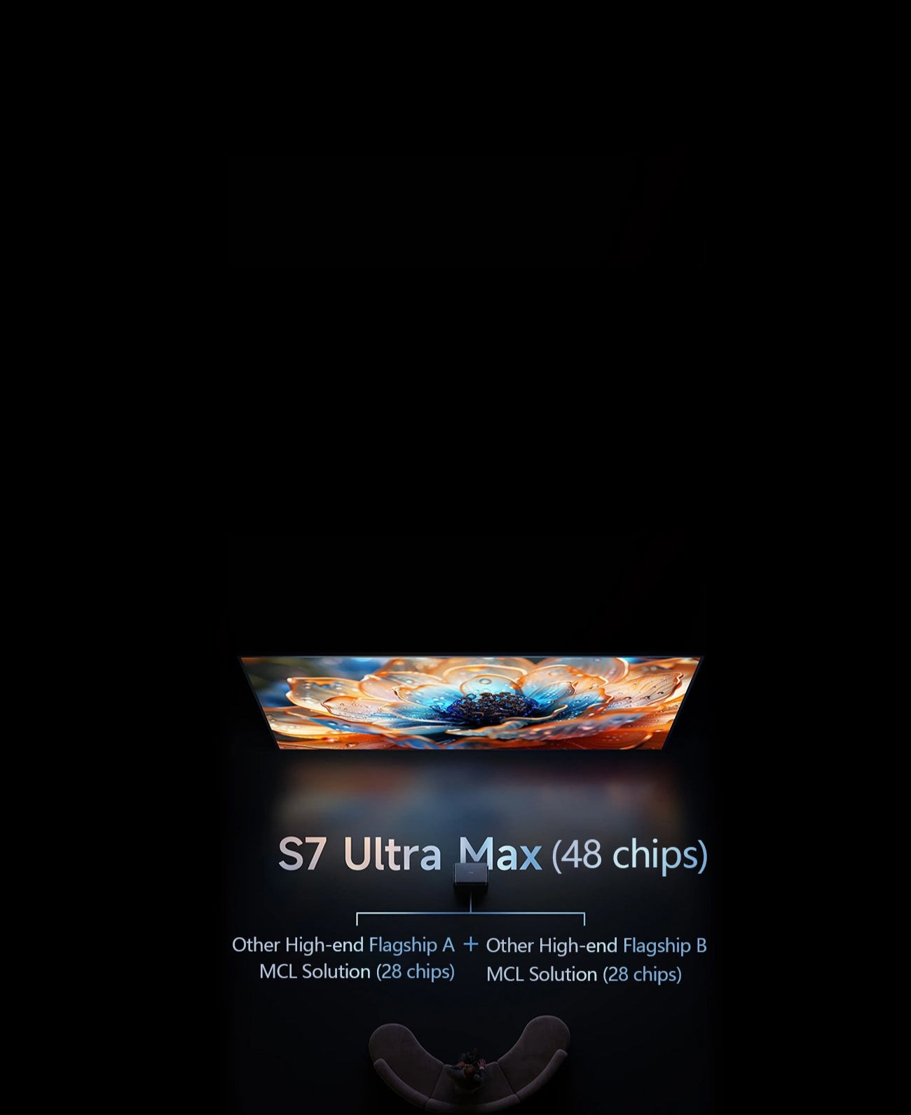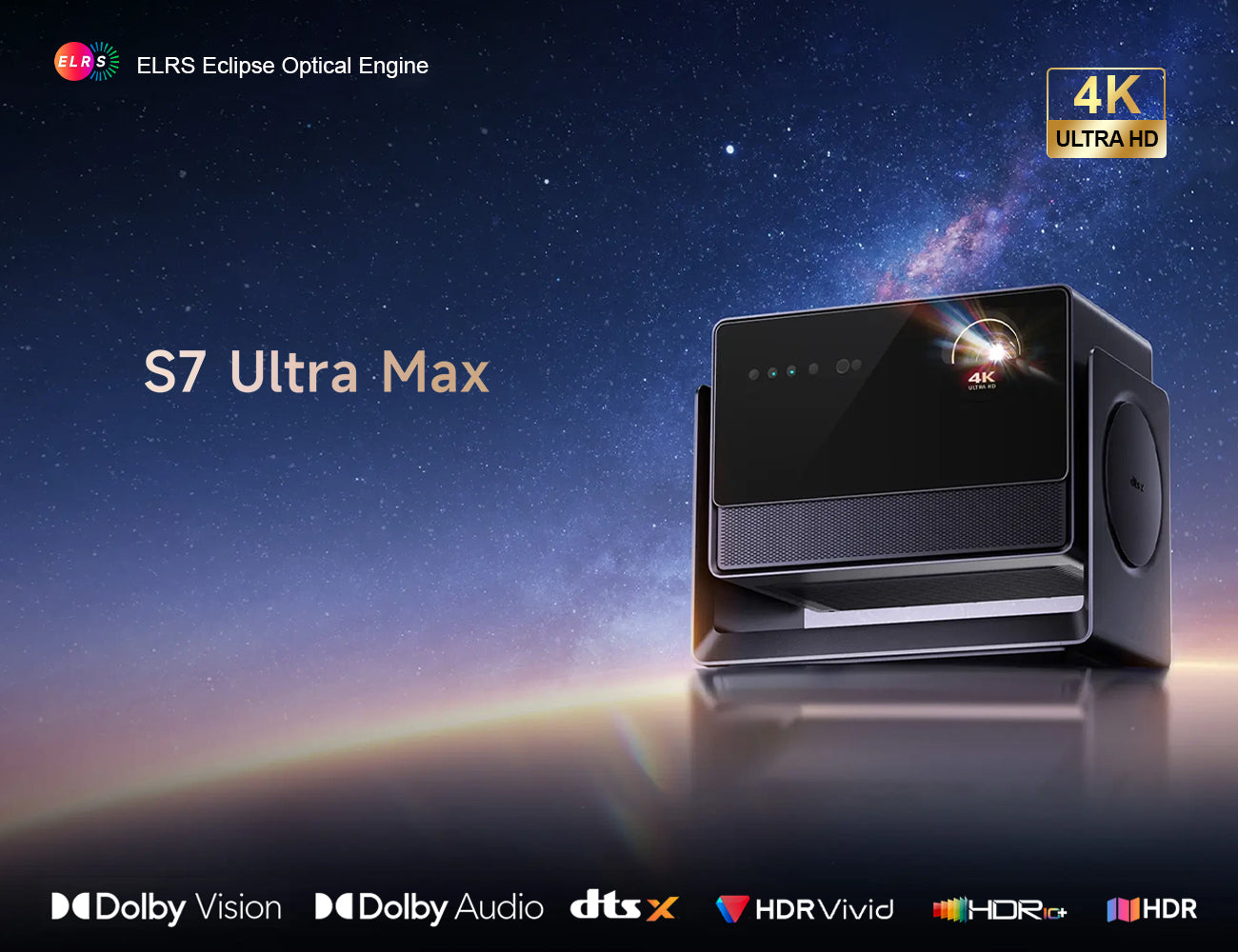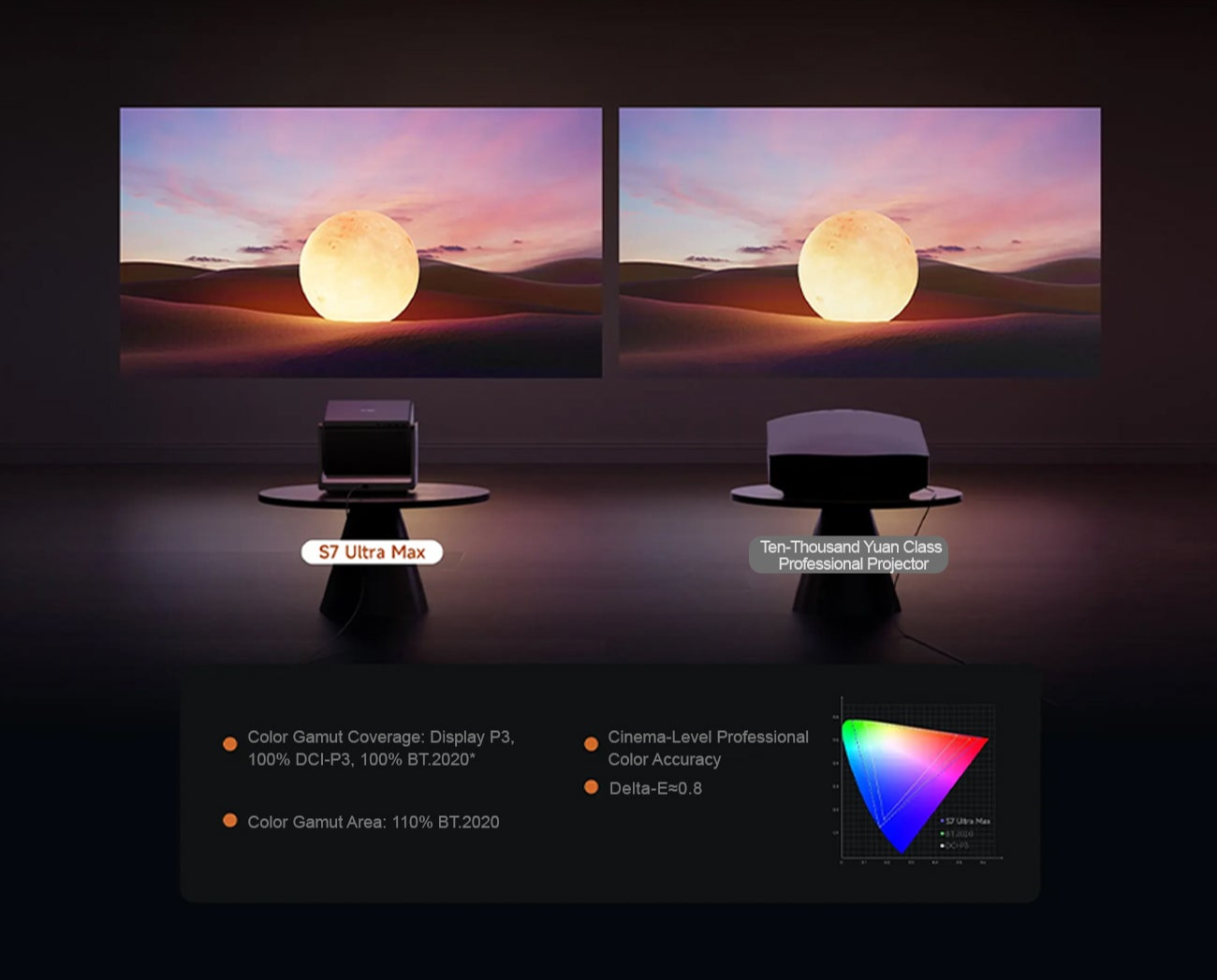 Powered by a custom ELRS optical engine and RGB laser light source, the S7 Ultra Max delivers stunning brightness at 5800 CVIA lumens. With 48 industrial-grade laser chips and advanced fusion technology, every scene bursts with lifelike clarity, rich contrast, and vibrant colors across 100% DCI-P3 and BT.2020 color spaces.
