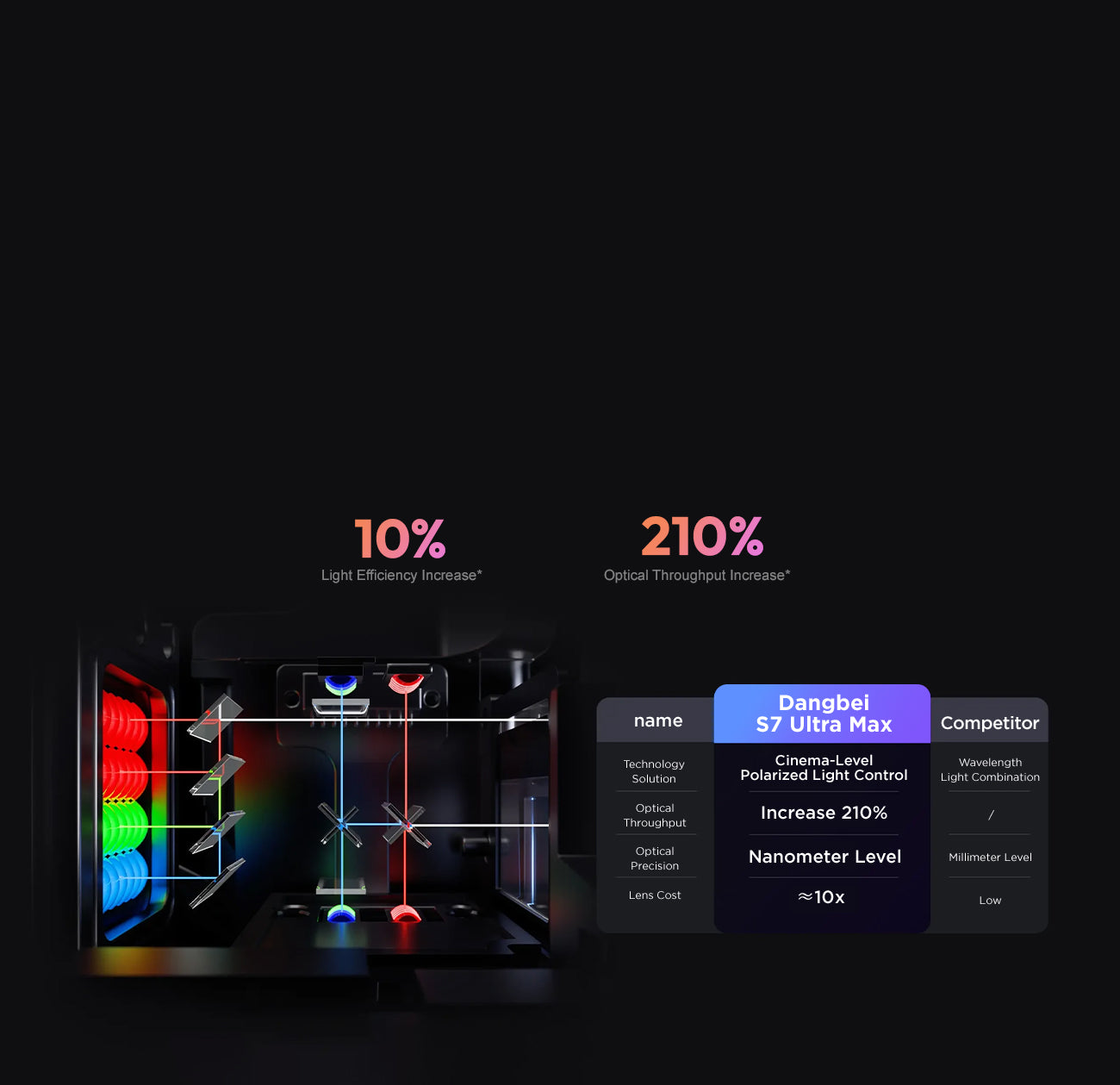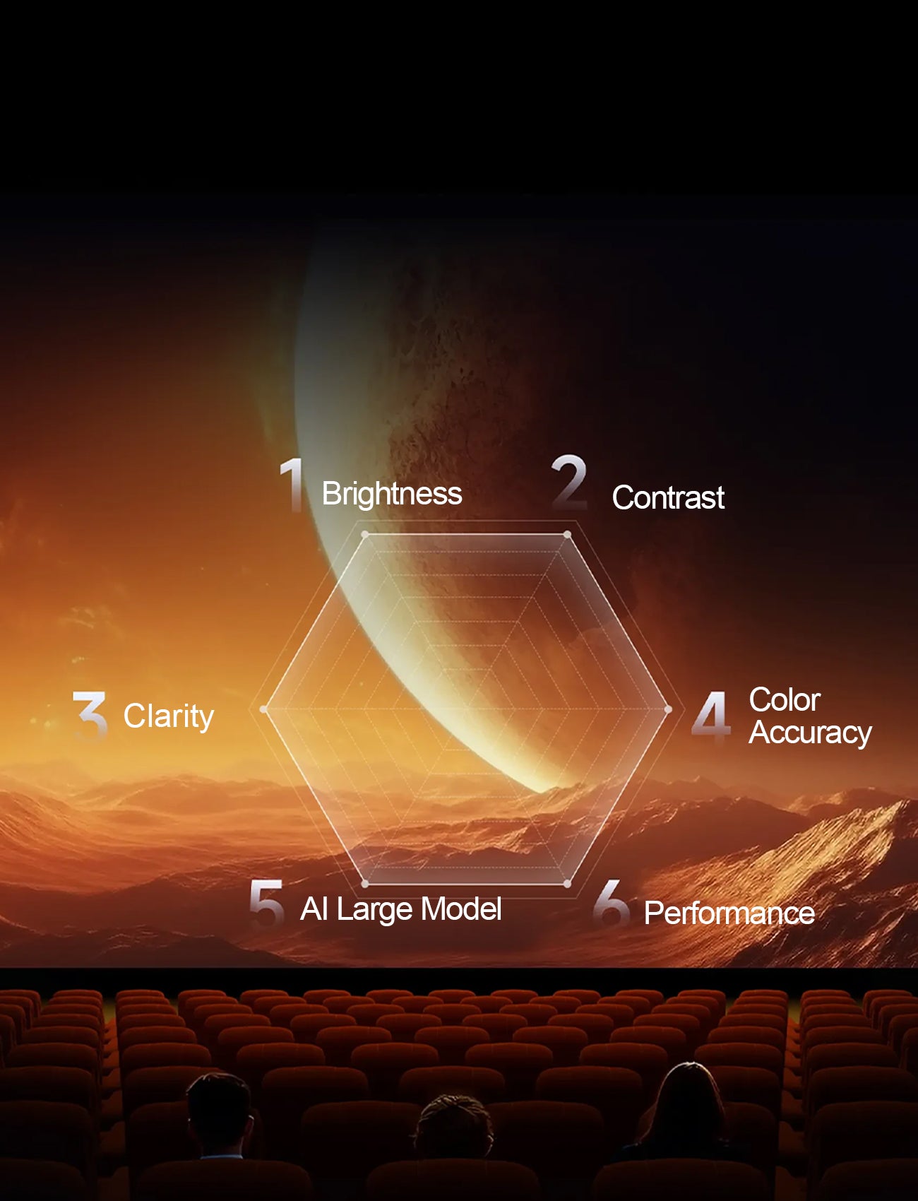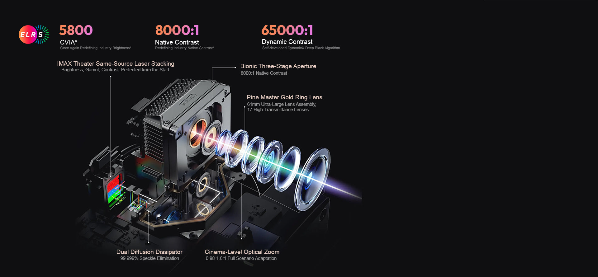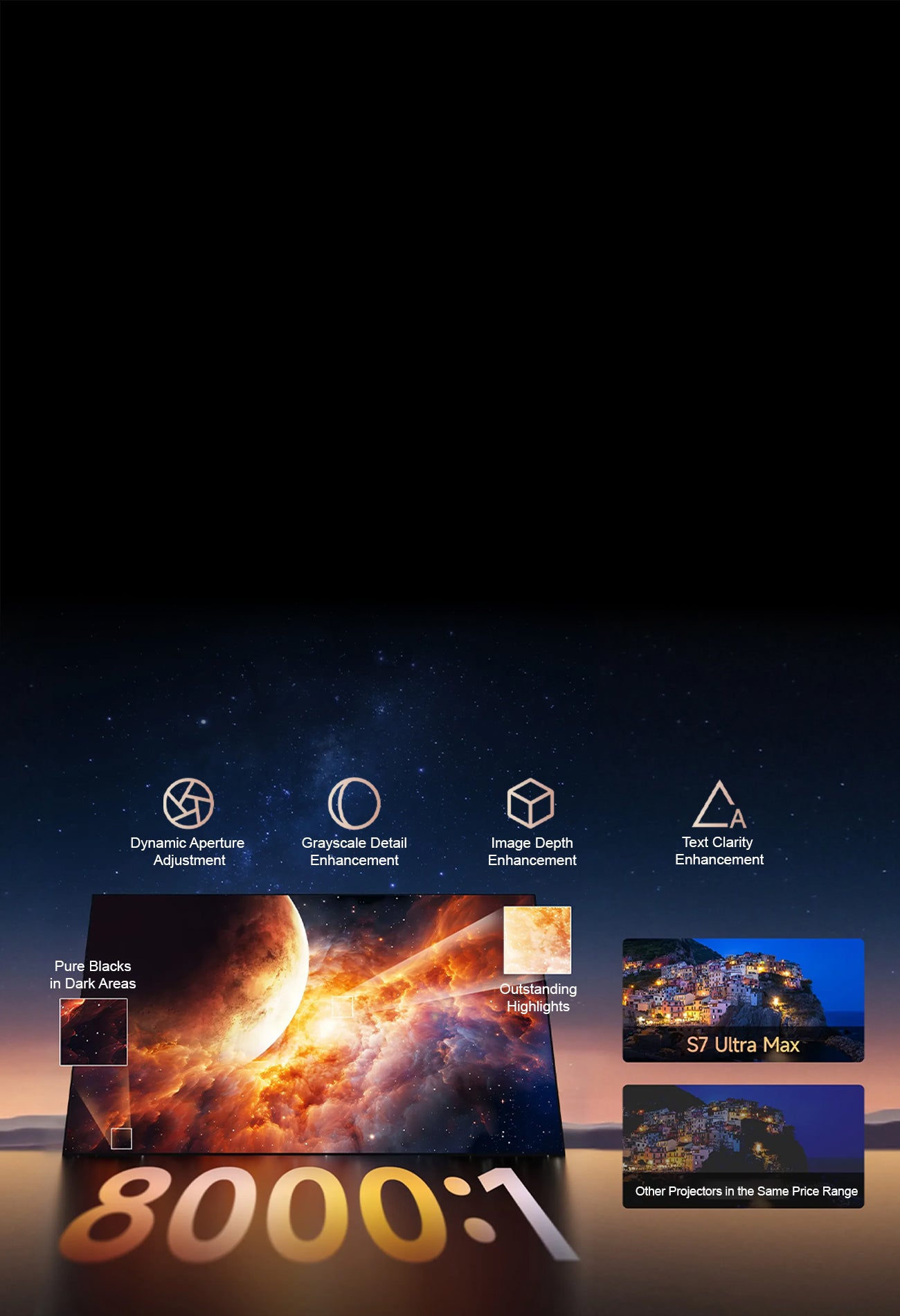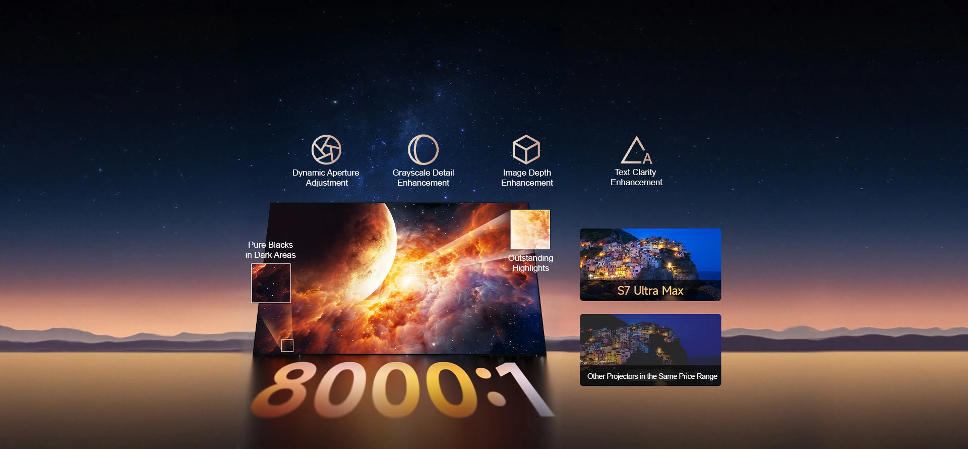Powered by a custom ELRS optical engine and RGB laser light source, the S7 Ultra Max delivers stunning brightness at 5800 CVIA lumens. With 48 industrial-grade laser chips and advanced fusion technology, every scene bursts with lifelike clarity, rich contrast, and vibrant colors across 100% DCI-P3 and BT.2020 color spaces.