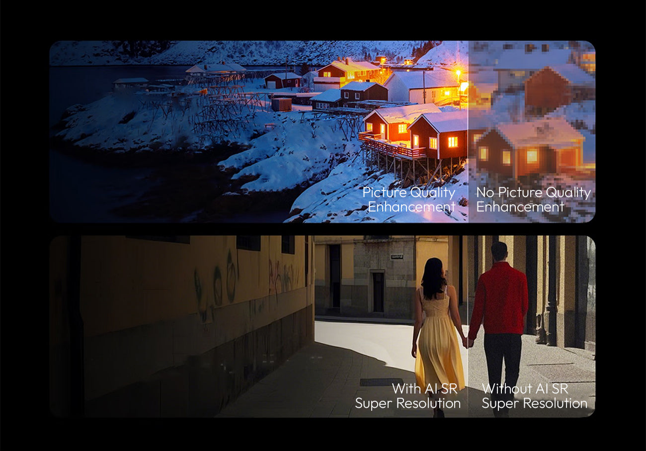 Powered by the MediaTek MT9681 Quad A73 processor, with 8GB RAM + 128GB storage, the built-in AI OS 6.0 intelligently adapts to your environment. Features include auto focus, obstacle avoidance, screen alignment, and human-eye protection sensors. With Wi-Fi 6 and Bluetooth 5.2, plus support for AirPlay, Android Cast, Huawei Cast+, and Miracast, streaming has never been easier.