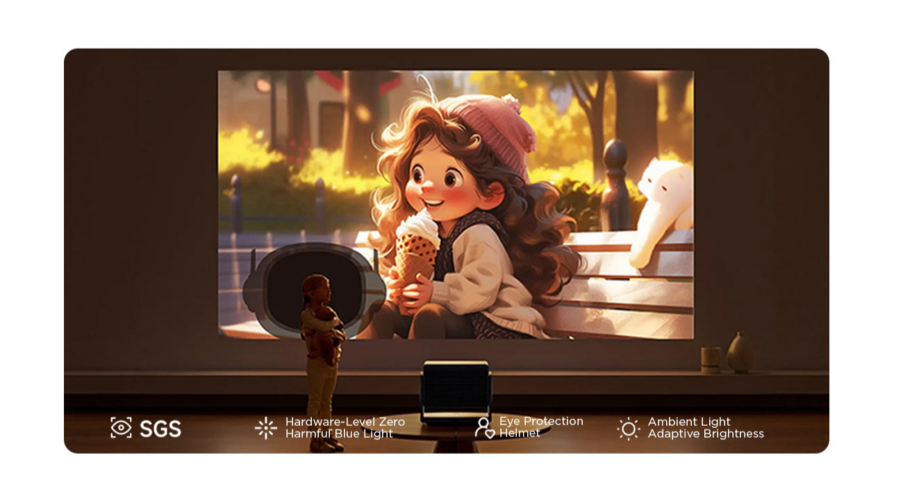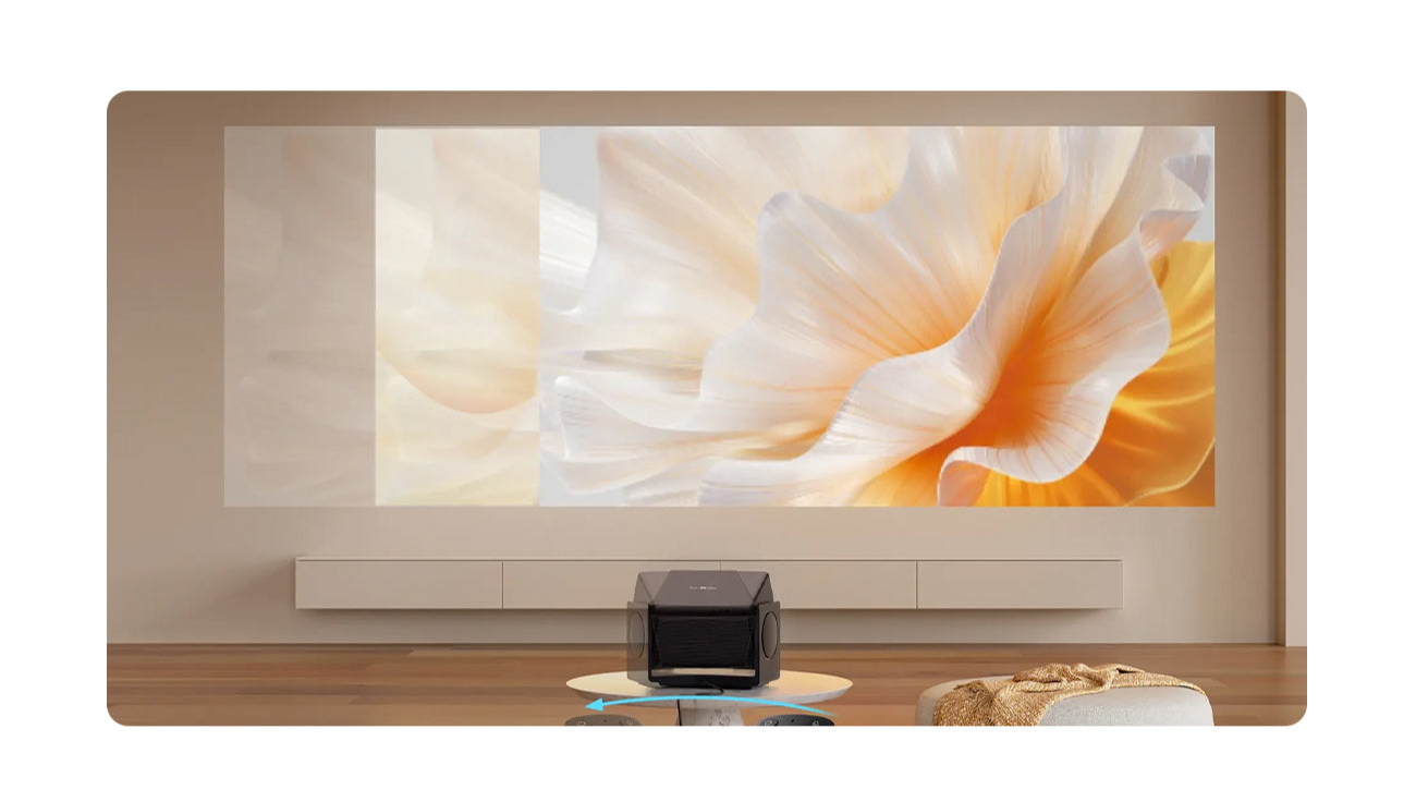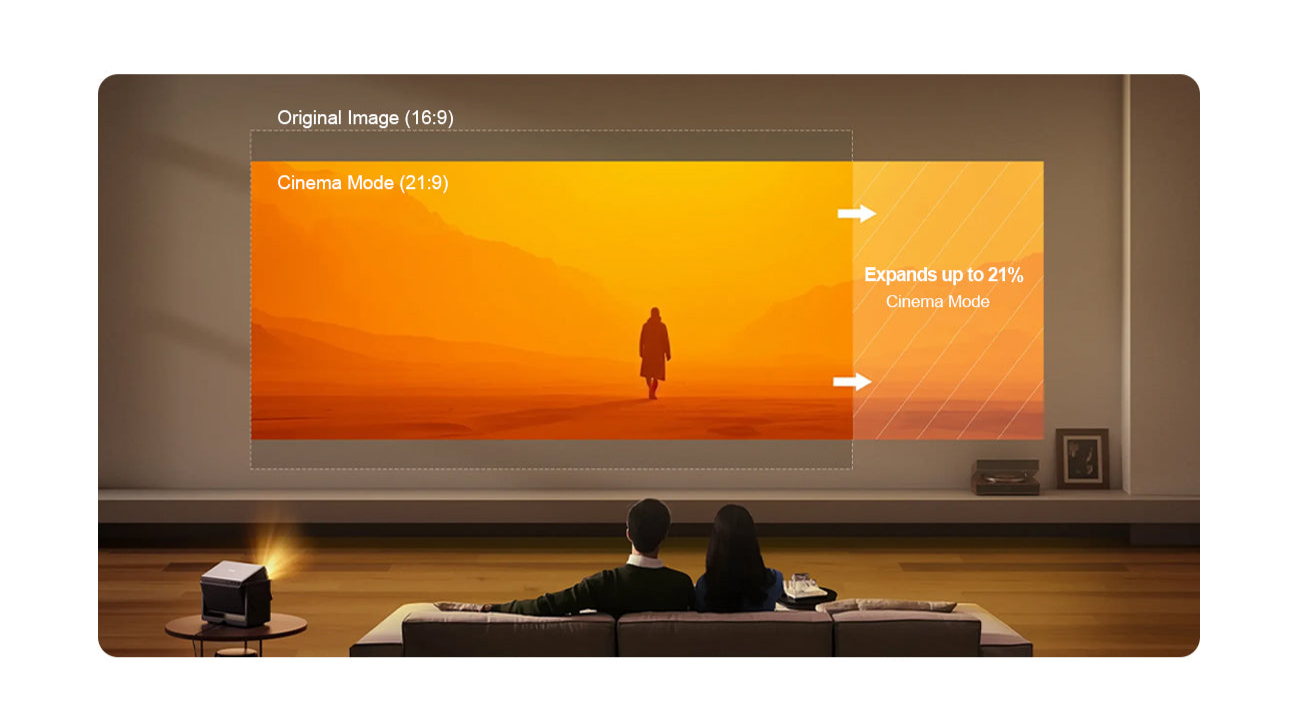 The projection screen self-adapts to the film's 21:9 ultra-wide ratio. The picture can be expanded by up to 21%, instantly transforming into a cinema's broad field of view.