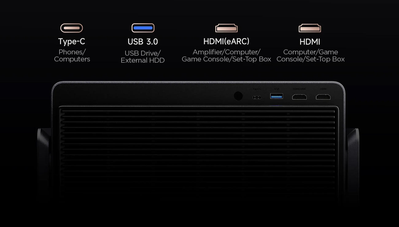Fully equipped with HDMI 2.1*(eARC) port, Type-C, USB 3.0. Supports connecting to phones, computers, game consoles (Switch, PS4, PS5, XBOX, etc.), and audio/video devices.