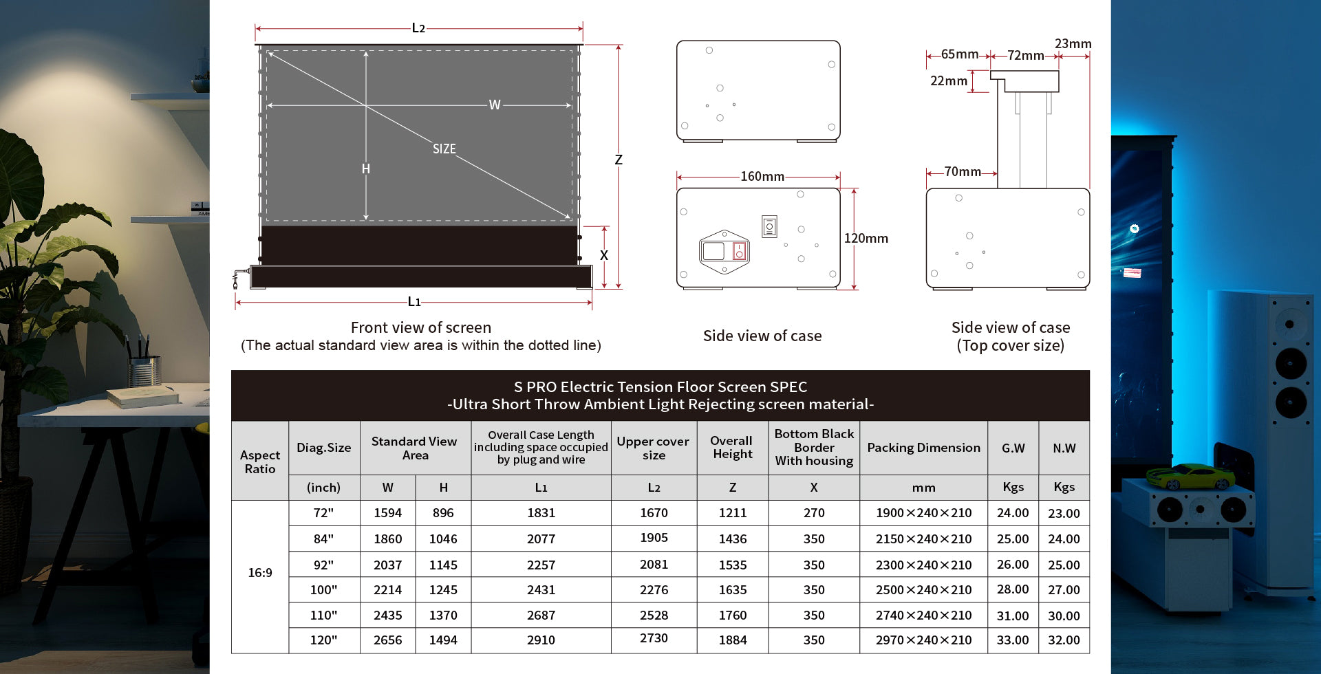 ●ultra courte focale Matière de rejet de lumière ambiante (ALR/CLR; Technologie lenticulaire noire / blanche) -Uniquement assorti pour Ultra Courte Focale Laser vidéoprojecteur et s'installer sur la table / le sol