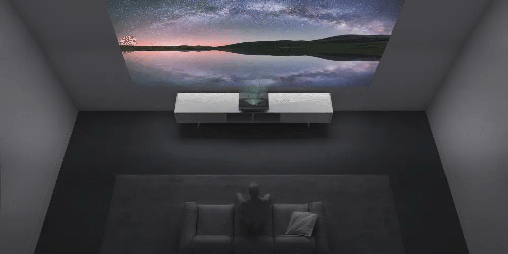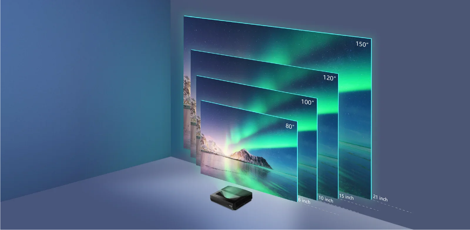 Bomaker Polaris 4K Laser TV peut être positionné à l'avant d'une pièce comme un téléviseur et projeter toujours un affichage jusqu'à 150pouce à une distance ultra courte de 28 pouce à la surface d'affichage, ou 100pouce à seulement 10 pouce Loin sans ombres. Cela vous permet de profiter d'une image plus grande dans un espace plus petit sans changer la disposition de votre pièce. Pas besoin de faire face à un câblage ou à des obstructions difficiles.