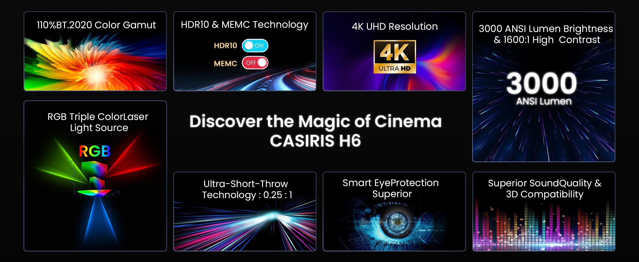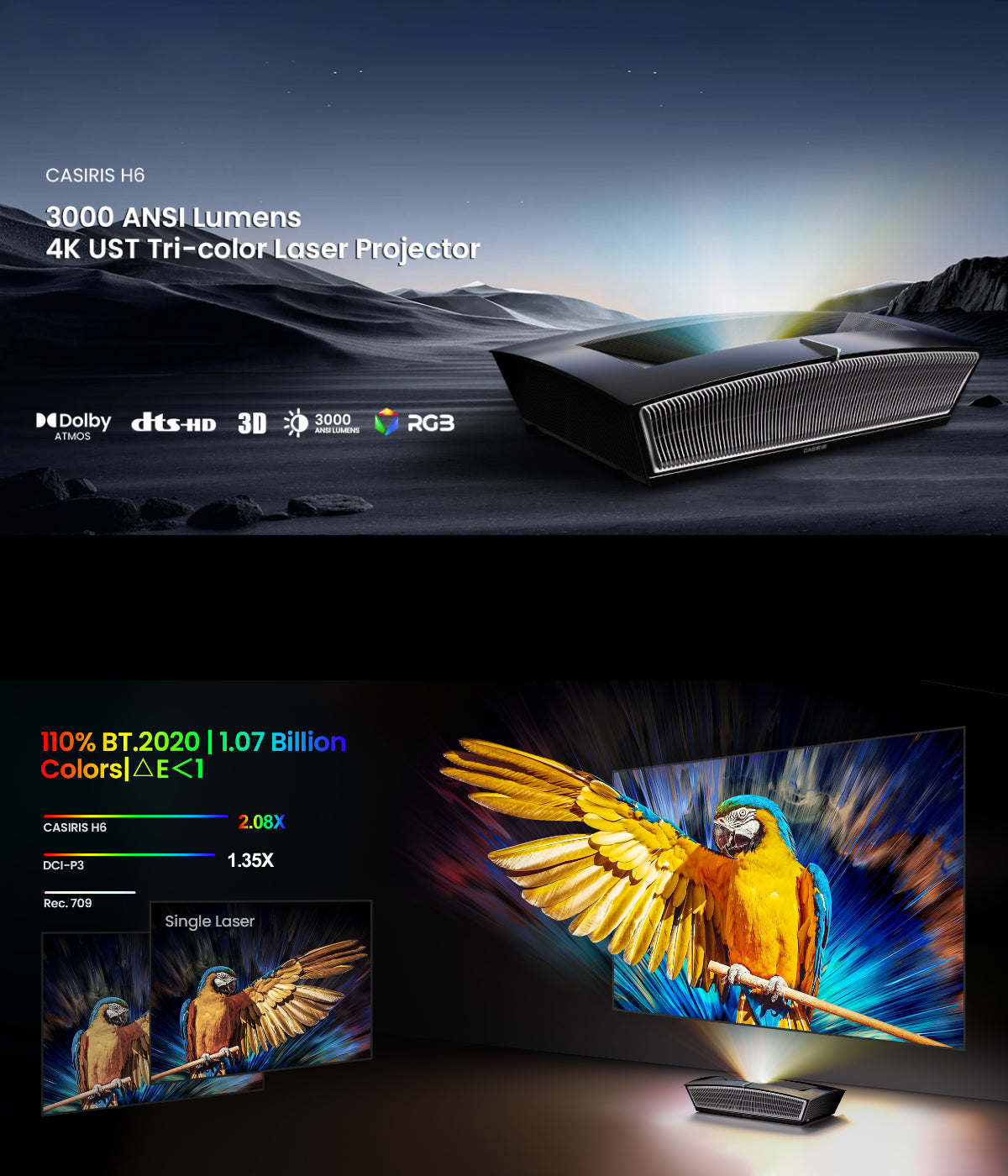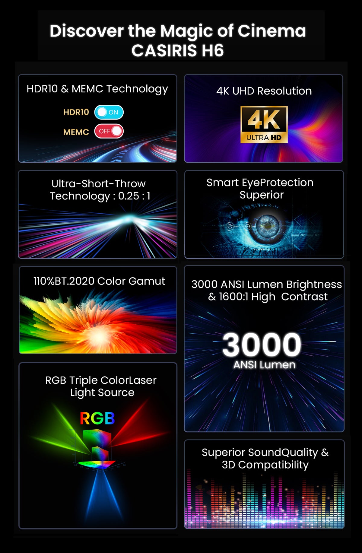 - 【Triple Tech laser】Le Casiris H6 possède une source de lumière laser RVB avancée RVB, la distinguant de vidéoprojecteurs dépendant uniquement d'une source de lumière bleue. Ce design révolutionnaire évite la nécessité d'une roue chromatique, garantissant une précision de couleur impeccable. Offrir des adieux aux artefacts de roues à colorier et s'immerger dans des visuels présentés sous leur forme authentique et non fraterrée.