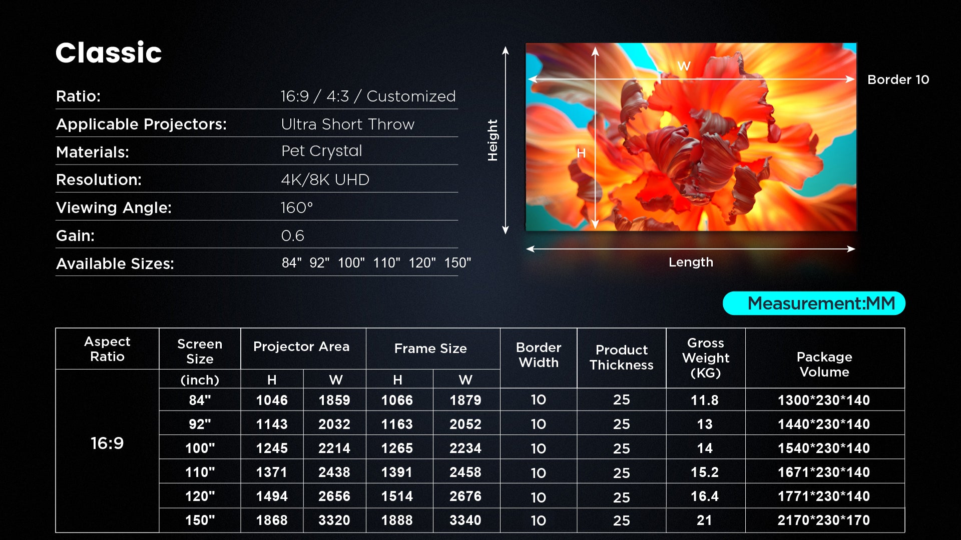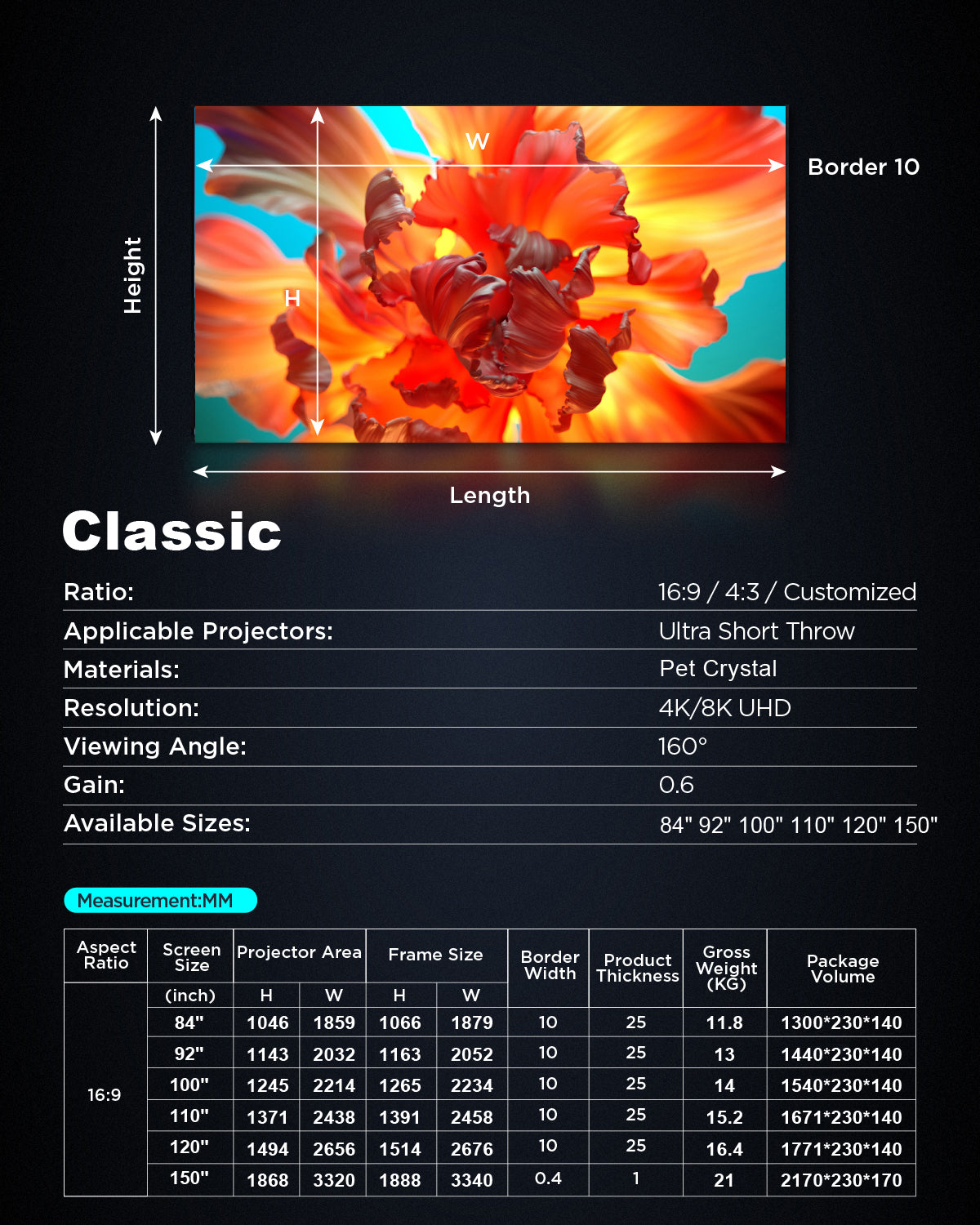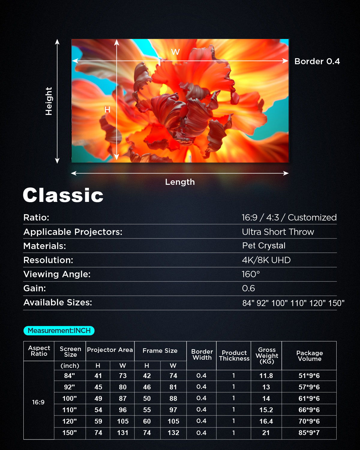 100''-150'' Nothing Projector Pet Crystal Classic ALR/CLR Écran Pour Vidéoprojecteur Ultra Courte Focale
