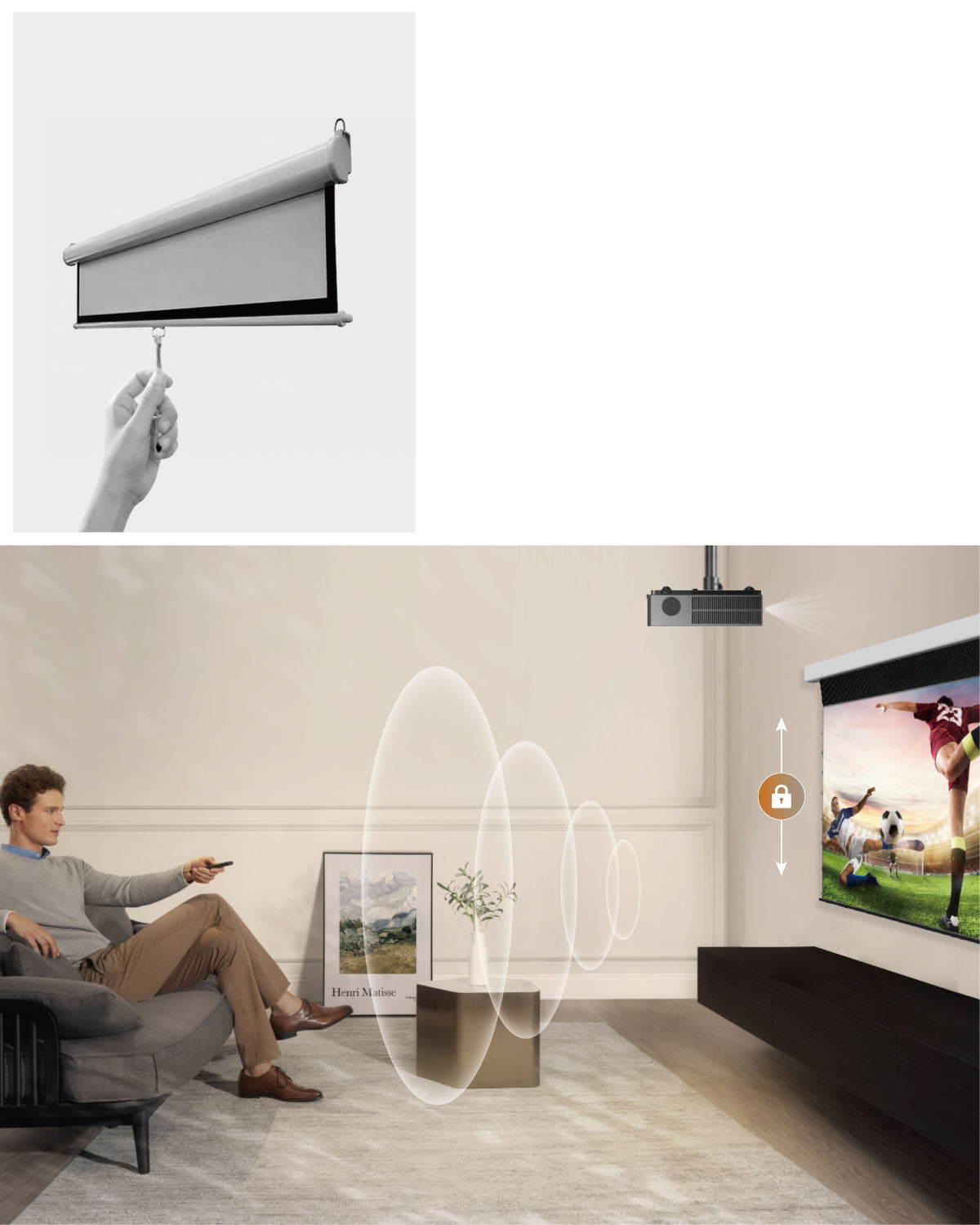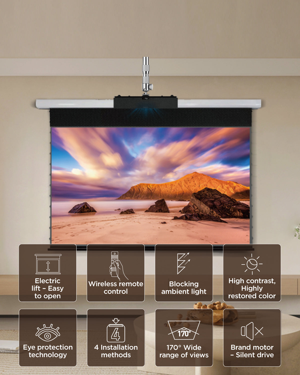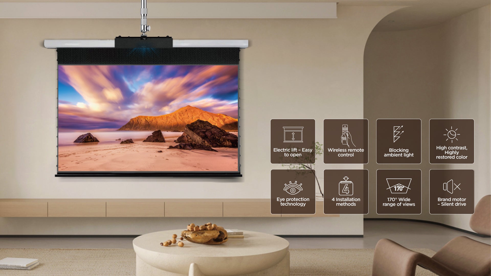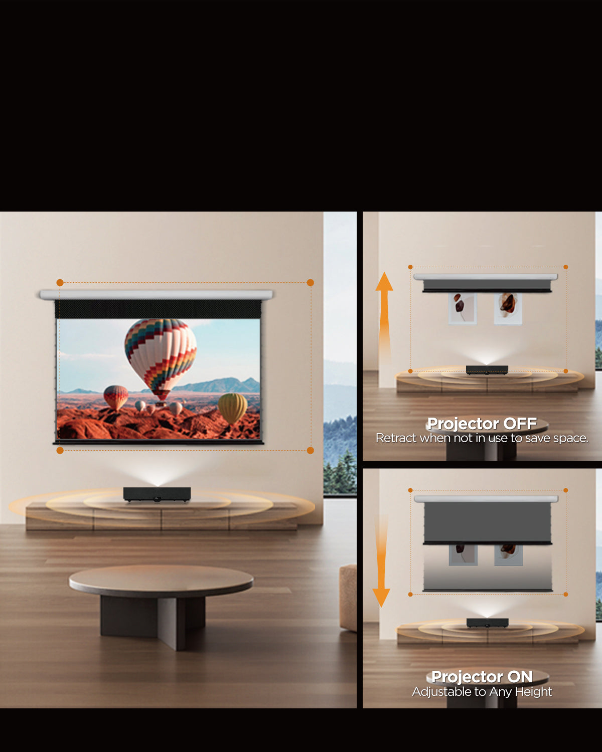 Profitez d'une image parfaitement plane à chaque utilisation. Le système de tension par cordes maintient l'écran parfaitement tendu, tandis que le moteur tubulaire silencieux assure un fonctionnement discret. Un système de levage électrique intégral rétracte l'écran dans son boîtier aluminium élégant lorsqu'inactif – épuré, compact et stylé.
