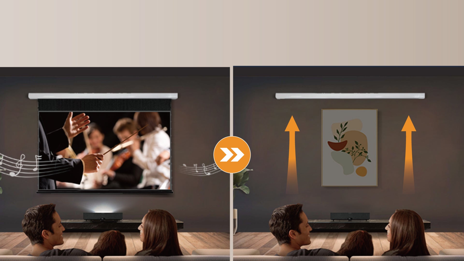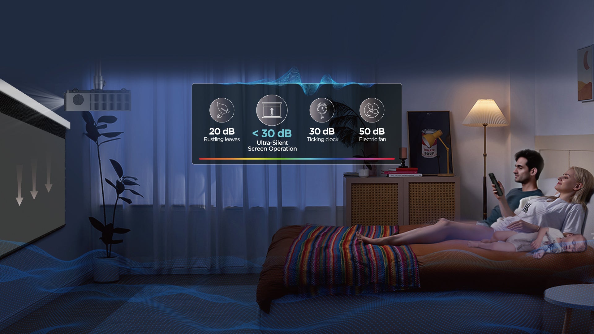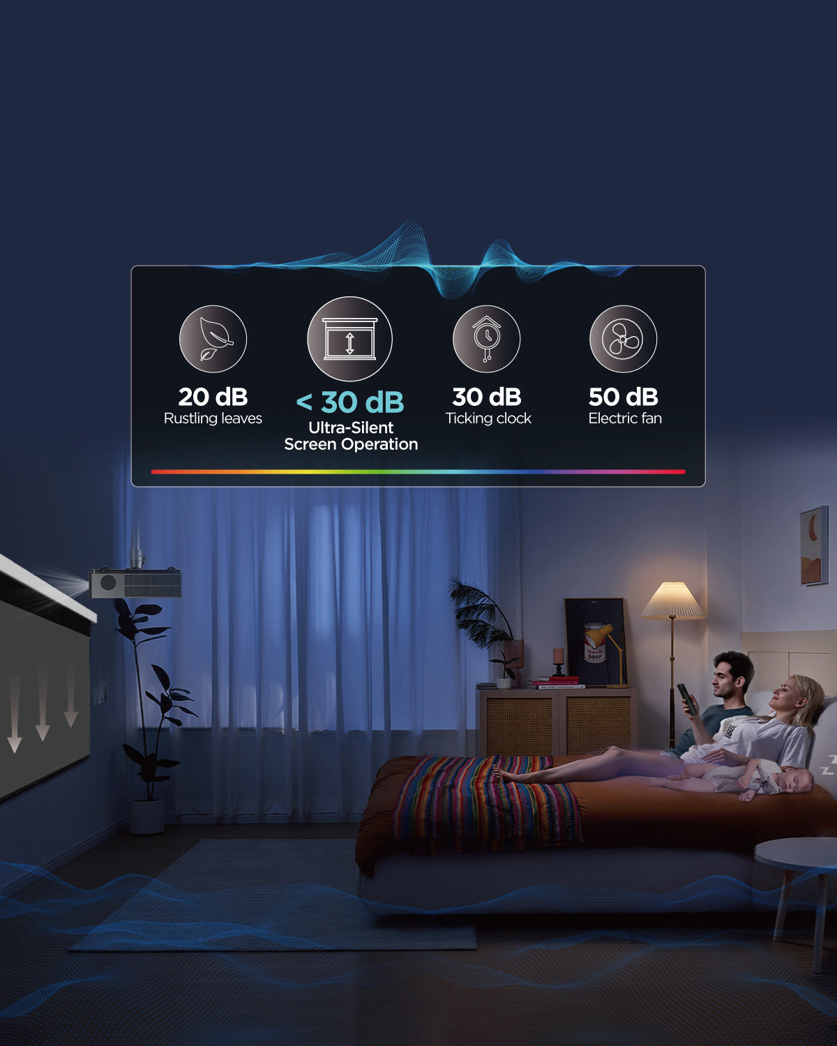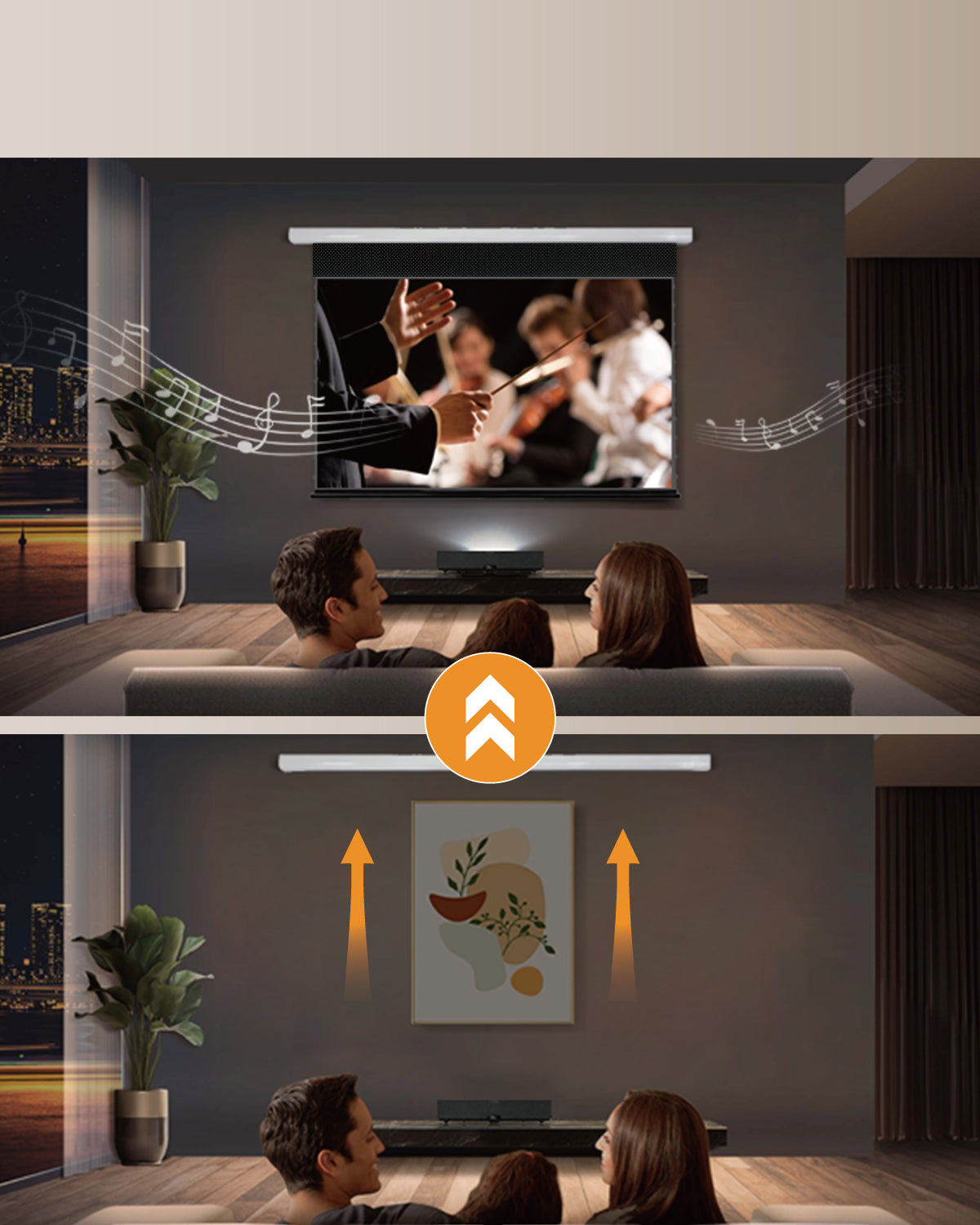 Profitez d'une image parfaitement plane à chaque utilisation. Le système de tension par cordes maintient l'écran parfaitement tendu, tandis que le moteur tubulaire silencieux assure un fonctionnement discret. Un système de levage électrique intégral rétracte l'écran dans son boîtier aluminium élégant lorsqu'inactif – épuré, compact et stylé.