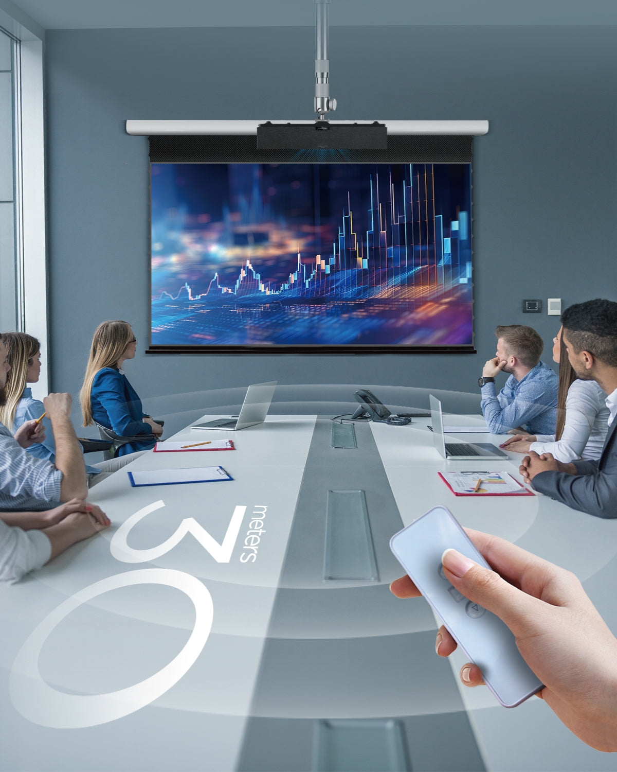 Contrairement aux écrans manuels traditionnels, l'écran déroulant Slimline de la série Black Series offre une réelle commodité avec son contrôle sans fil. Opérez votre écran sans effort jusqu'à 30 mètres grâce à sa télécommande RF longue portée. Depuis votre canapé ou n'importe où dans la pièce, ajustez votre écran d'une simple pression – sans fil, sans effort, sans vous lever.