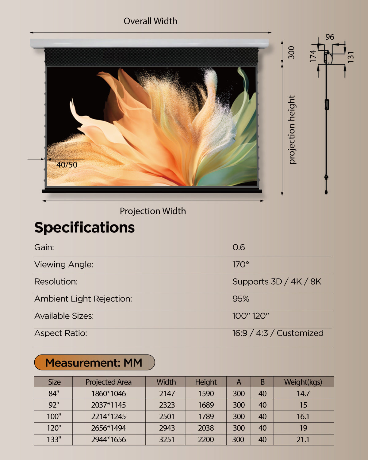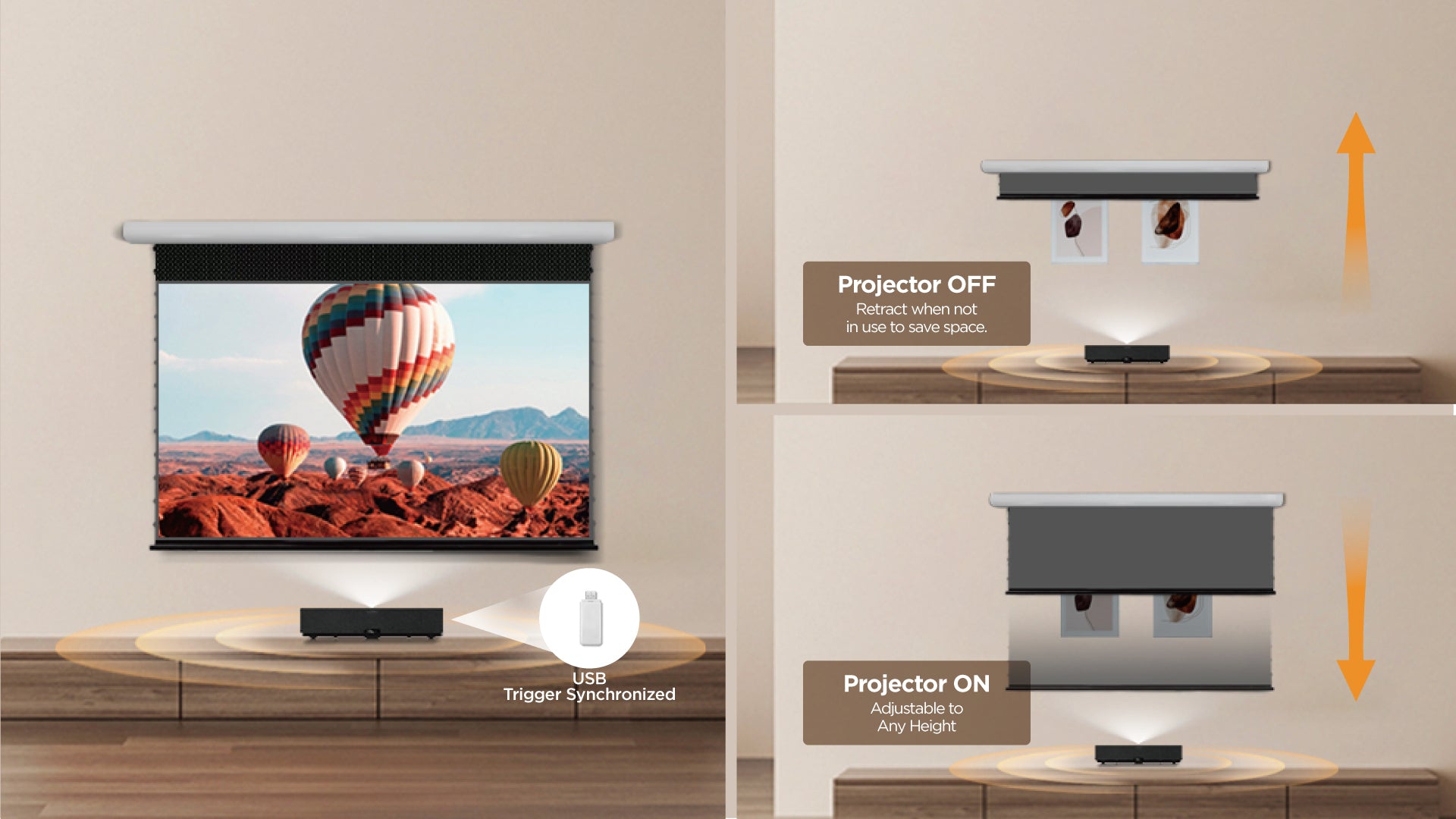 Disponible en tailles de 84 à 120 pouces, cet écran est idéal pour les home cinémas premium, salles multimédias et environnements AV professionnels. Associé à un vidéoprojecteur UST haut-lumen, il libère tout le potentiel du divertissement cinématographique.