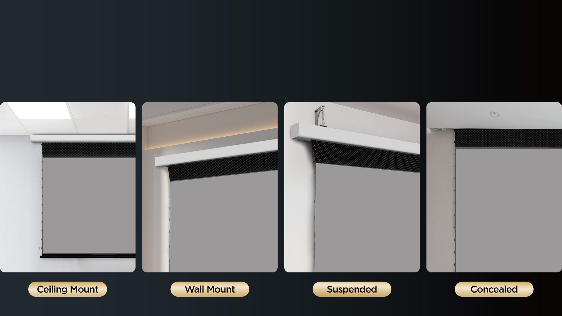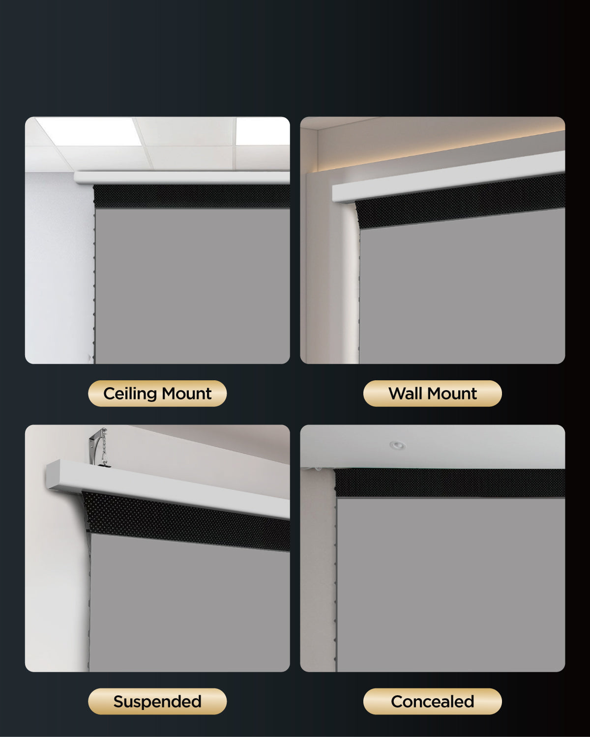 Supporte les installations au plafond, murale, suspendue ou encastrée pour une flexibilité totale. Quelle que soit votre configuration spatiale ou esthétique, l'écran Slimline s'intègre parfaitement.