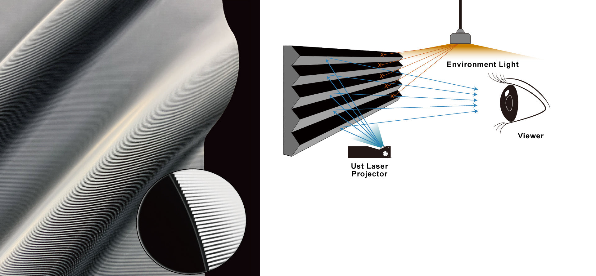 La source de lumière d'interférence ci-dessus est absorbée par le prisme spécial TPU, et la source de lumière projetée par le téléviseur laser ci-dessous se reflète en parallèle.
