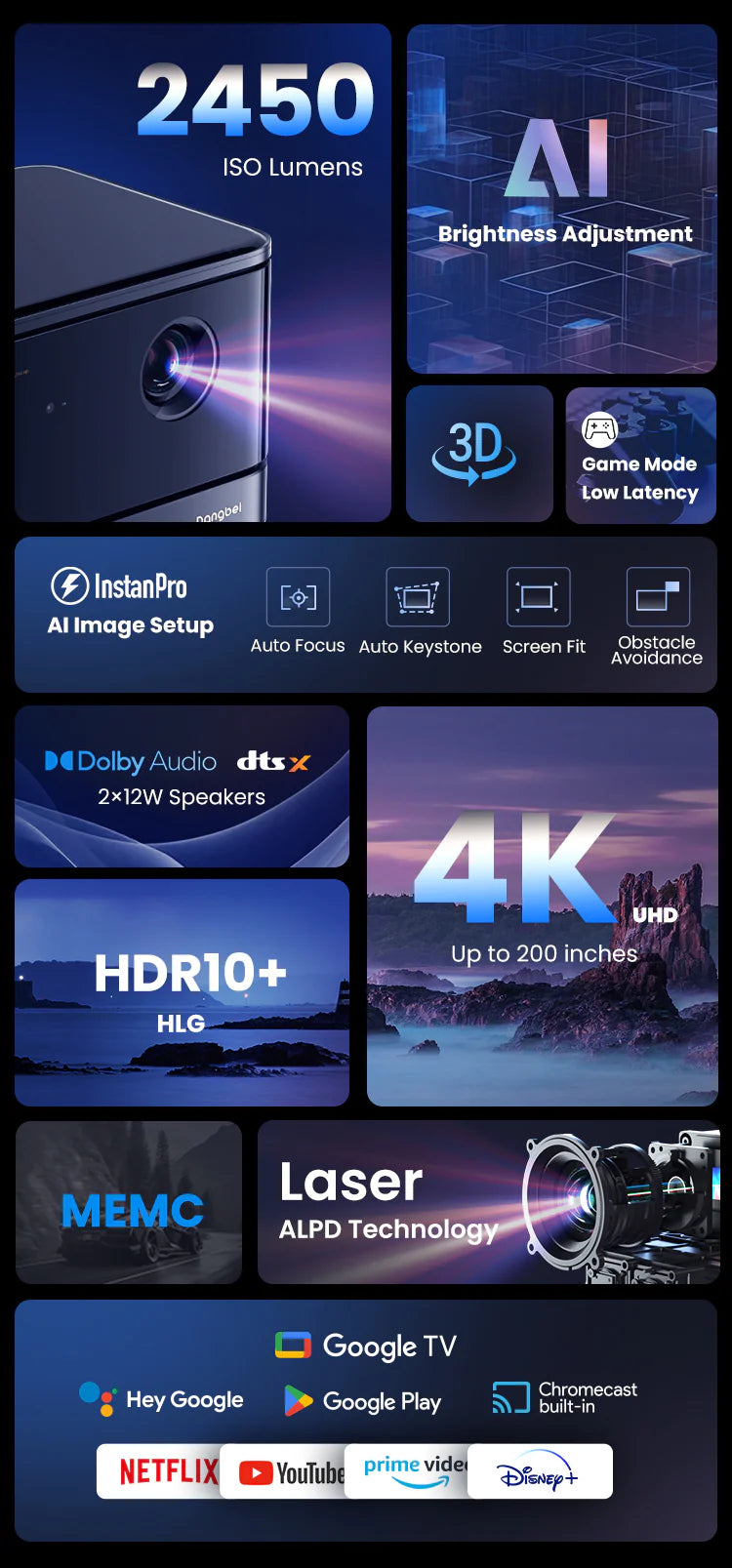 InstanPro AI Image Setup is a smart system for image optimization, utilizing a combination of dToF, CMOS, and AI for a range of functionalities. Users can enjoy autofocus, auto keystone, screen fit, obstacle avoidance, eye protection, and AI brightness control—all designed for a perfect viewing experience.