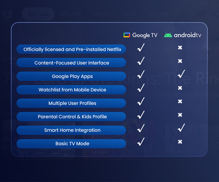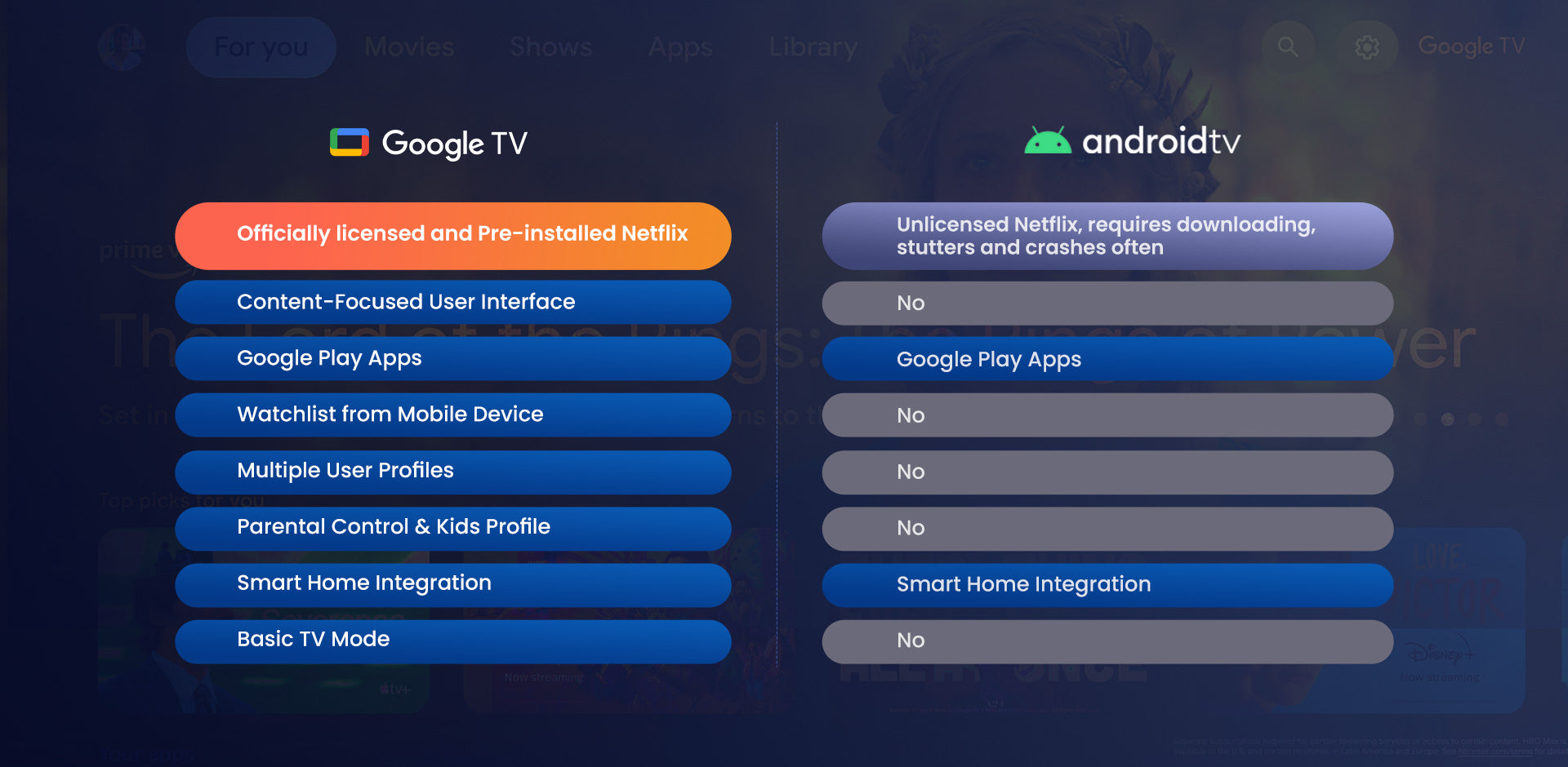 Google TV is an evolution of the Android TV platform. While Android TV focuses on individual apps, Google TV enhances the user experience by curating content from different streaming services and providing a more integrated interface. Apart from the licensed Netflix app, it also includes new features like Watchlist, multiple profiles, and more.