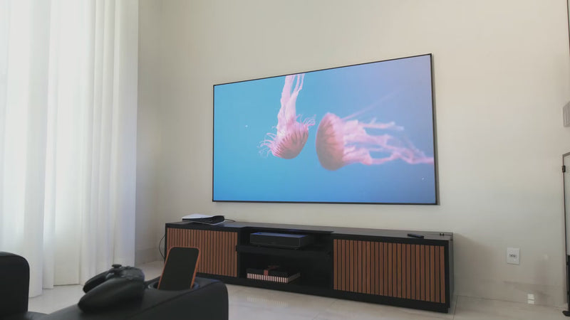 With a minimalist 1cm ultra-narrow bezel, the screen sits nearly flush to your wall, creating a sleek, modern look that complements any living room or theater space. When powered on, it disappears into the picture — like a window into another world.