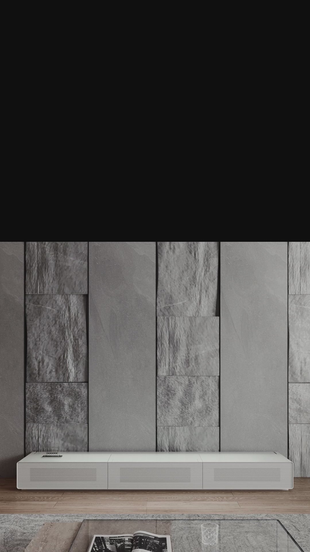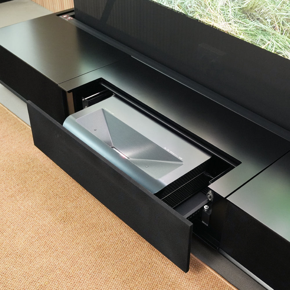 The Shore ROLATV Rollable Laser Matte TV Cabinet is an intelligent all-in-one media unit designed specifically for ultra-short-throw laser projectors. Featuring a three-section cabinet structure, it combines modern aesthetics with high functionality. Its unique center-mounted electric drawer design, combined with high-quality solid wood and veneer materials, has excellent load-bearing capacity and brings a quiet experience. It is the ideal choice for users who value both appearance and functionality.