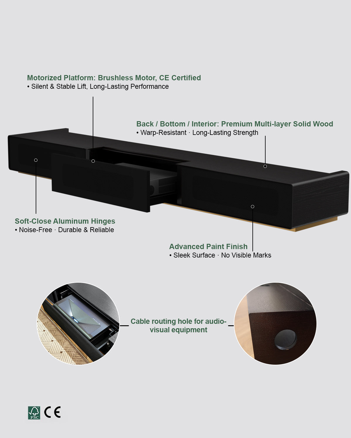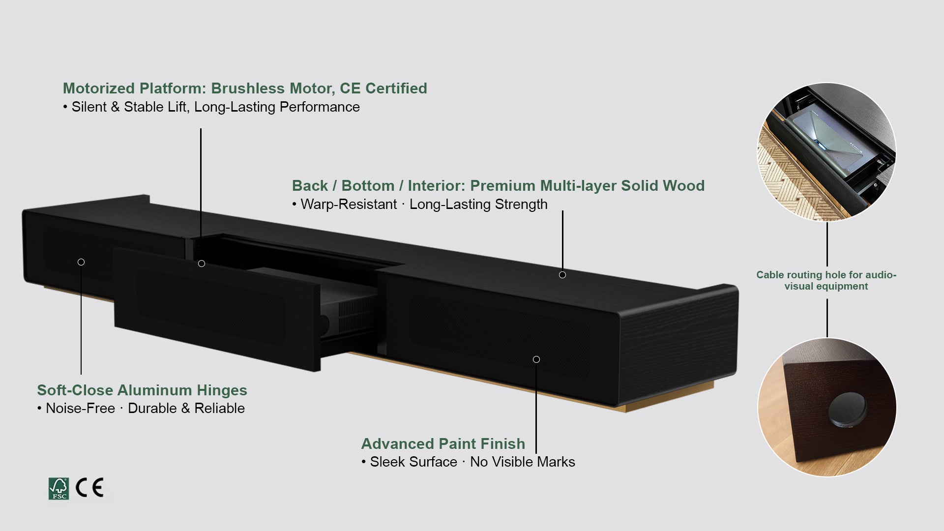 - Pricing is for the cabinet only. To purchase a motorized floor-rising screen, please [click here].