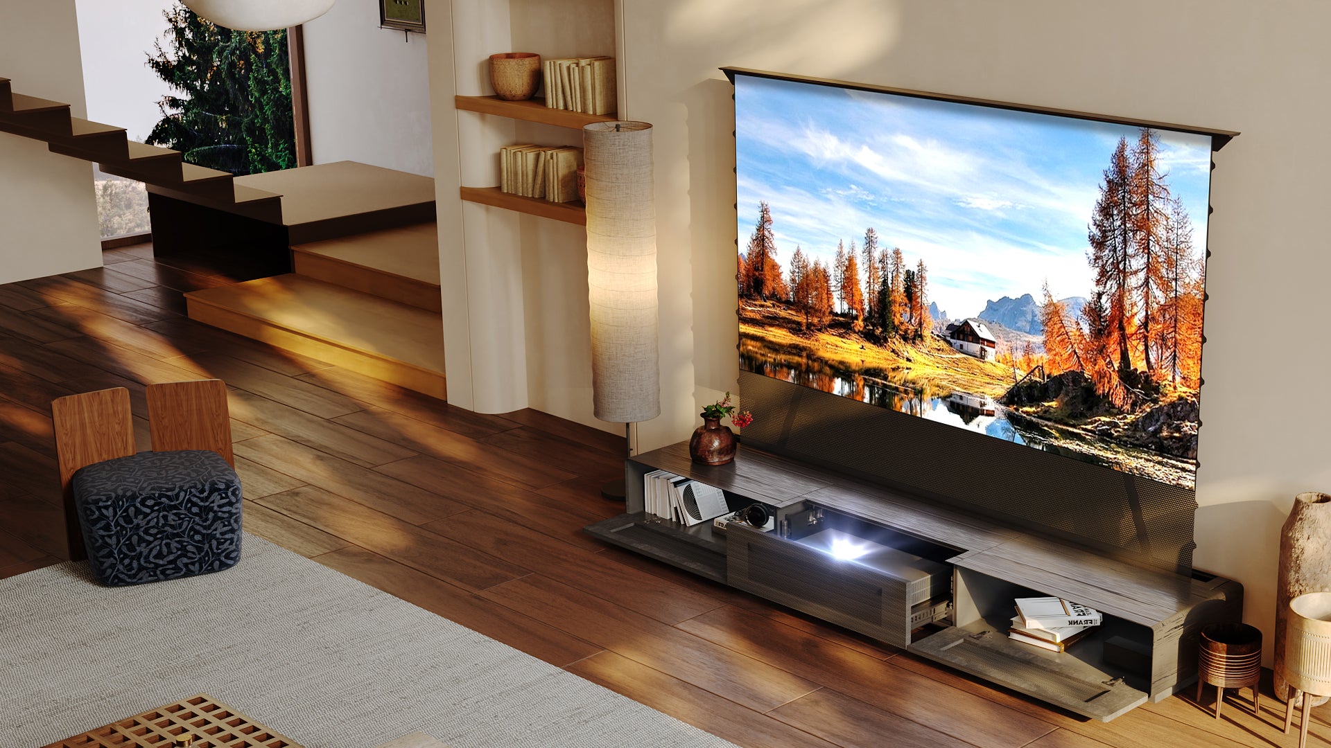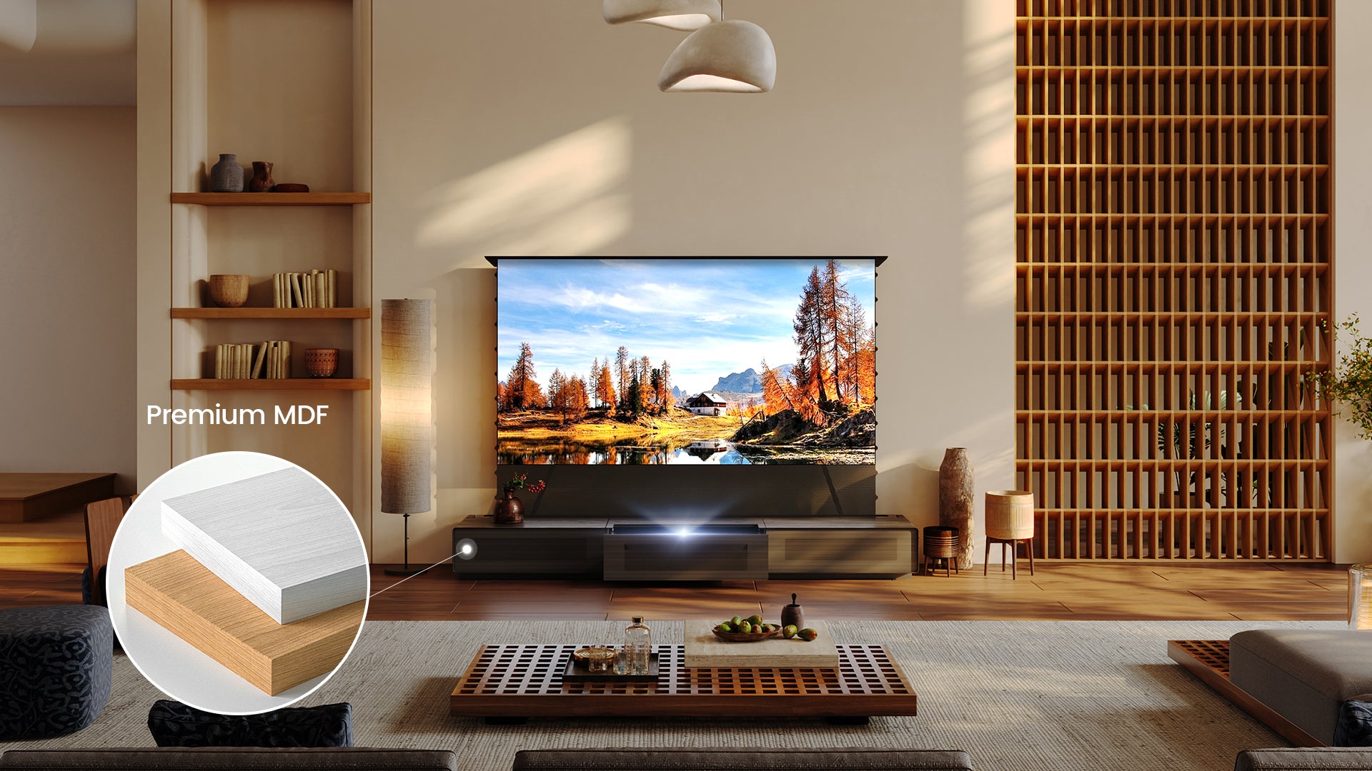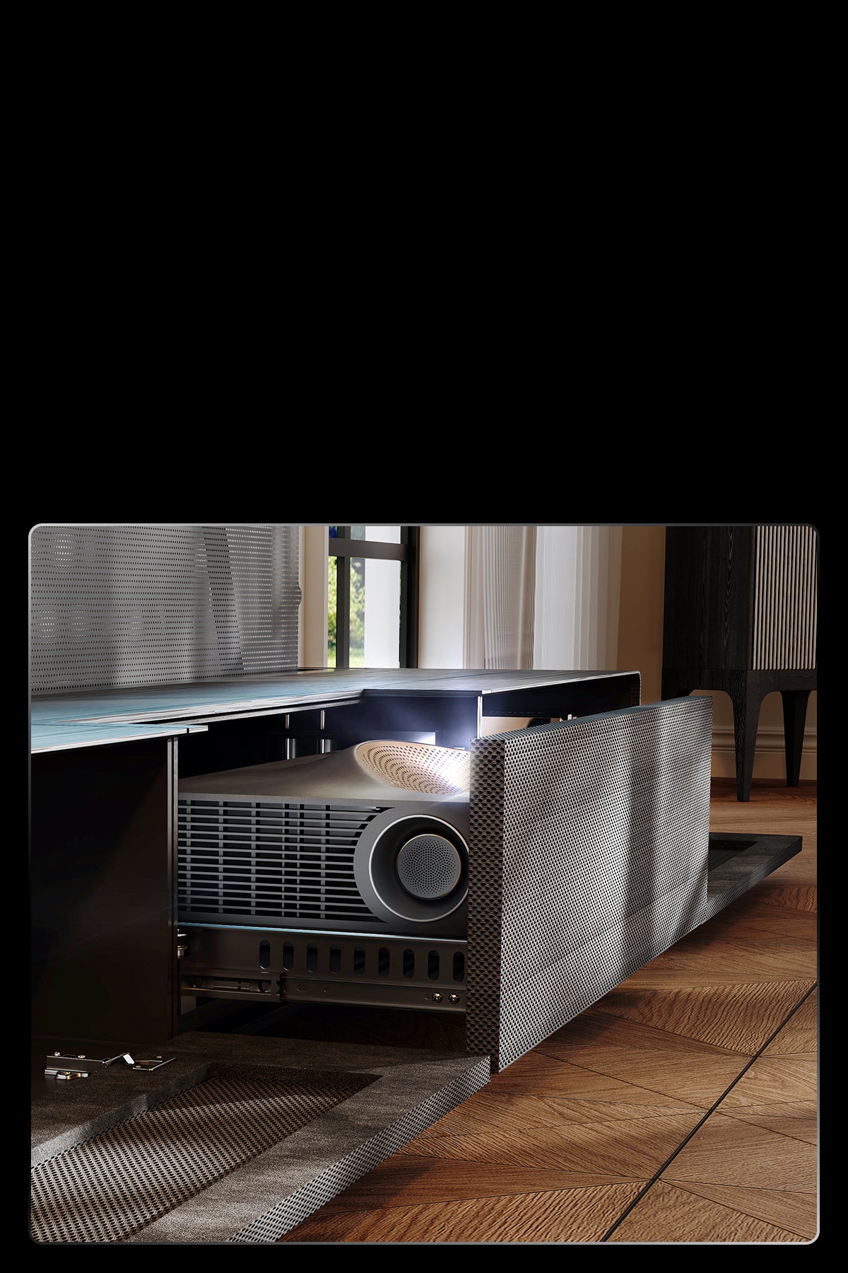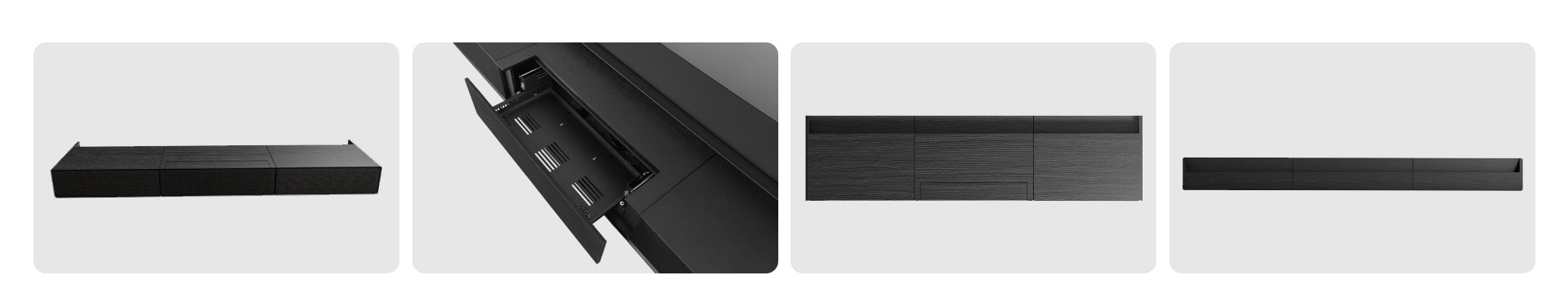 The Shore ROLATV Rollable Laser TV Cabinet is an intelligent all-in-one media unit designed specifically for ultra-short-throw laser projectors. Featuring a three-section cabinet structure, it combines modern aesthetics with high functionality. Its unique center-mounted electric drawer design, combined with high-quality solid wood and veneer materials, has excellent load-bearing capacity and brings a quiet experience. It is the ideal choice for users who value both appearance and functionality.