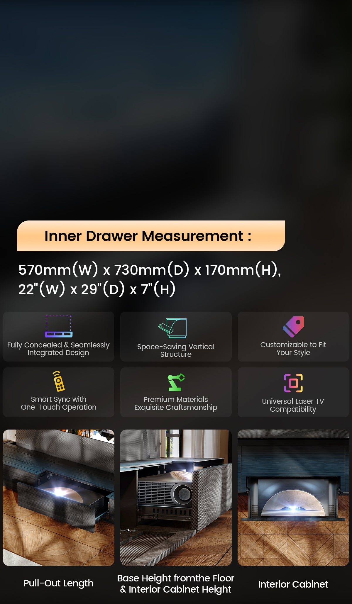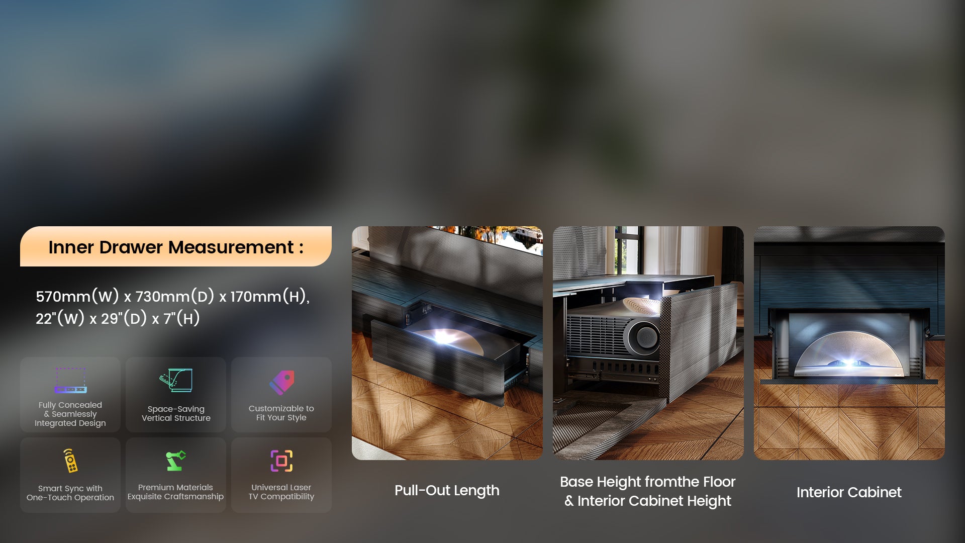 - Motorized Drawer Inner: 29"(L) x 15"(W) x 7"(H)