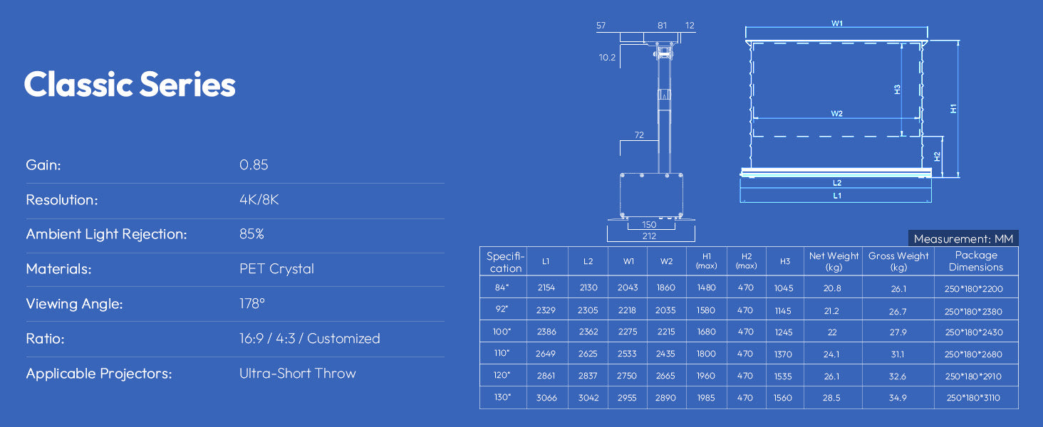 Skärmen är designad för moderna bostadsutrymmen och integrerar ett smidigt motoriserat golv-höjningsmekanism som möjliggör snabb installation och kompakt förvaring med en knapptryckning. Den passar perfekt med ultra-kort-kasta laserprojektorer för ett rent, rörigt-gratis hemmabioupplevelse.