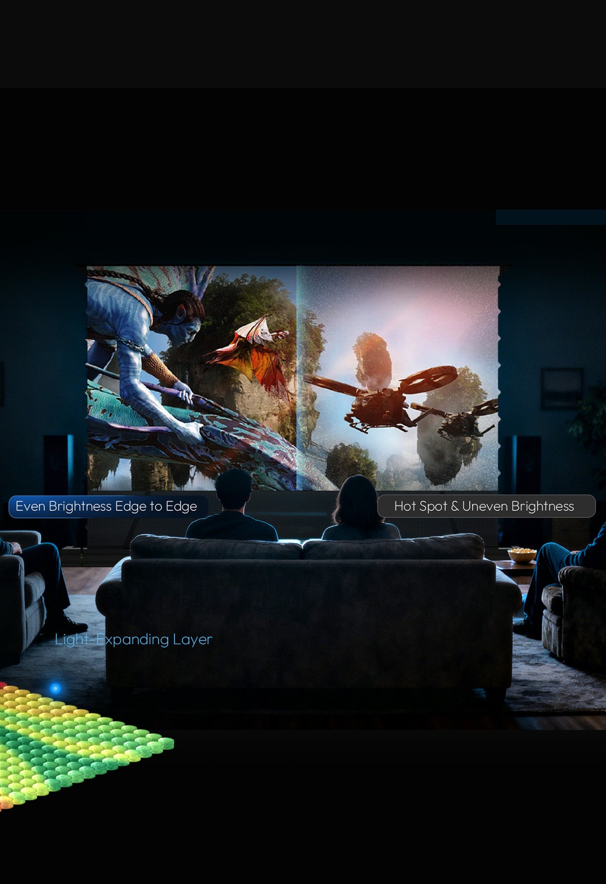 Med en 178° betraktningsvinkel, den optiska mikron-struktur säkerställer enhetlig ljusstyrka och konsekvent färg från alla sittplatser. Oavsett om det gäller familjevisning eller sociala utrymmen förblir bilden stabil och uppslukande.